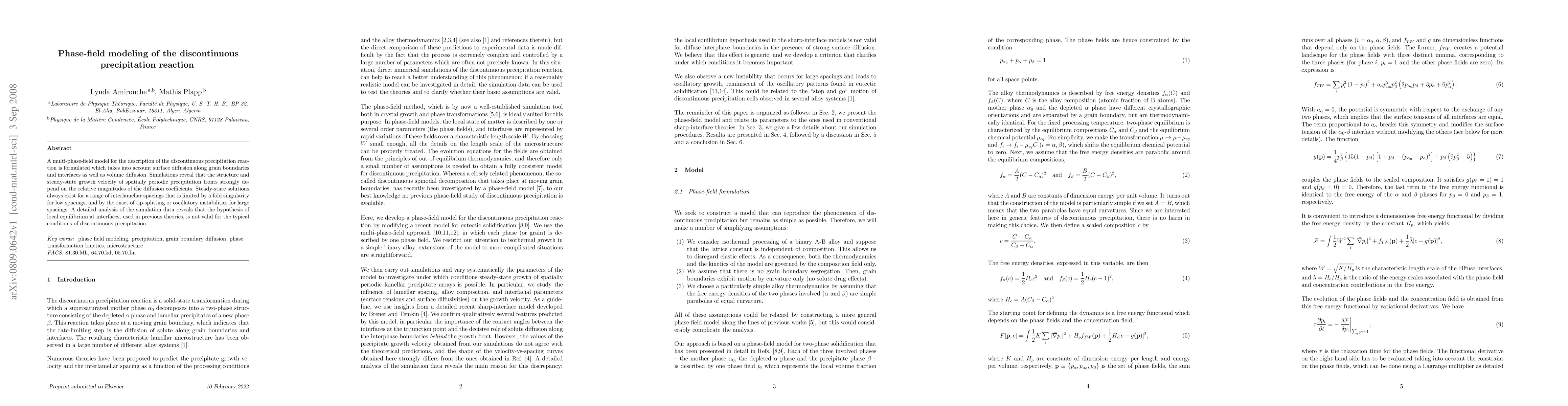 A multi-phase-field model for the description of the discontinuous precipitation reaction is formulated which takes into account surface diffusion along grain boundaries and interfaces as well as volume diffusion. Simulations reveal that the structure and steady-state growth velocity of spatially periodic precipitation fronts strongly depend on the relative magnitudes of the diffusion coefficients. Steady-state solutions always exist for a range of interlamellar spacings that is limited by a fold singularity for low spacings, and by the onset of tip-splitting or oscillatory instabilities for large spacings. A detailed analysis of the simulation data reveals that the hypothesis of local equilibrium at interfaces, used in previous theories, is not valid for the typical conditions of discontinuous precipitation.