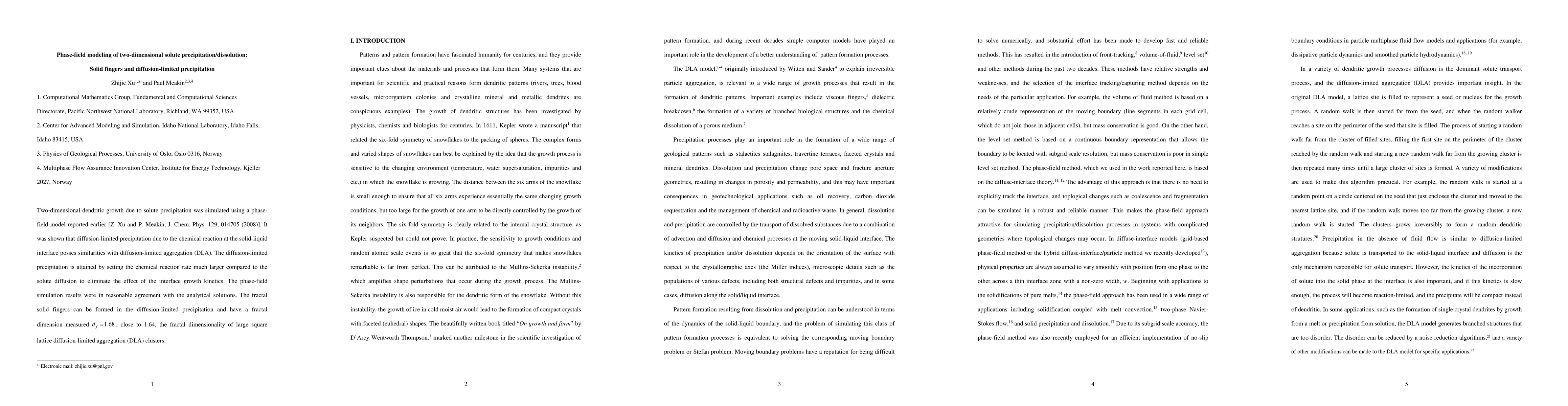 This paper uses a phase-field model to simulate two-dimensional dendritic growth from solute precipitation, demonstrating that diffusion-limited precipitation mimics diffusion-limited aggregation (DLA). The fractal solid fingers formed exhibit a fractal dimension close to 1.64, similar to DLA clusters.