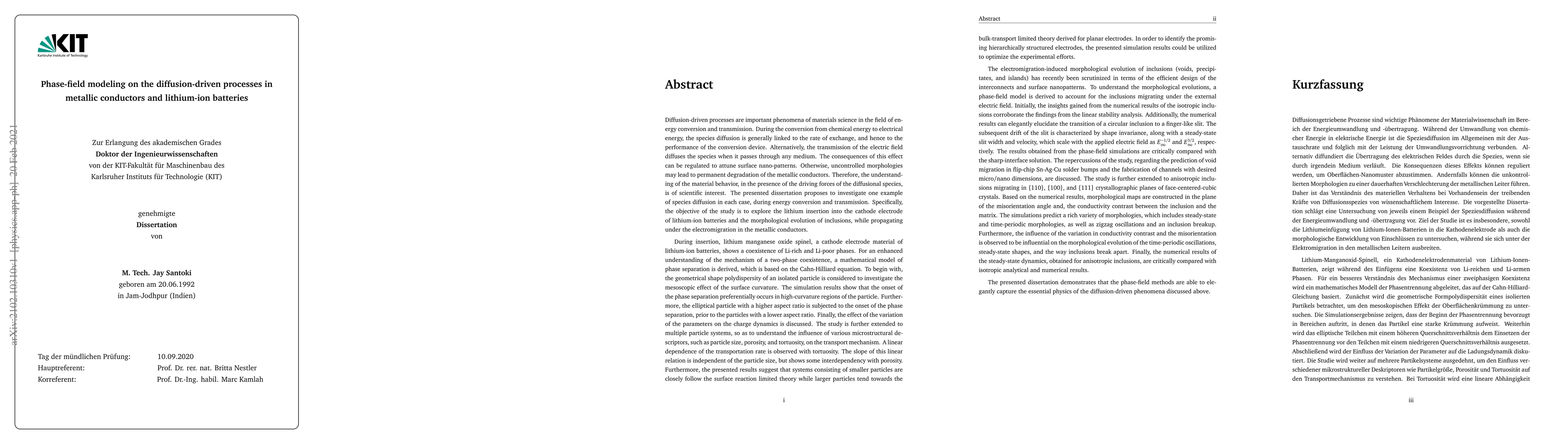 Diffusion-driven processes are important phenomena of materials science in the field of energy conversion and transmission. During the conversion from chemical energy to electrical energy, the species diffusion is generally linked to the rate of exchange, and hence to the performance of the conversion device. Alternatively, the transmission of the electric field diffuses the species when it passes through any medium. The consequences of this effect can be regulated to attune surface nano-patterns. Otherwise, uncontrolled morphologies may lead to permanent degradation of the metallic conductors. Therefore, the understanding of the material behavior, in the presence of the driving forces of the diffusional species, is of scientific interest. The presented dissertation proposes to investigate one example of species diffusion in each case, during energy conversion and transmission. Specifically, the objective of the study is to explore the lithium insertion into the cathode electrode of lithium-ion batteries and the morphological evolution of inclusions, while propagating under the electromigration in the metallic conductors. The presented dissertation demonstrates that the phase-field methods are able to elegantly capture the essential physics of the diffusion-driven phenomena discussed above.