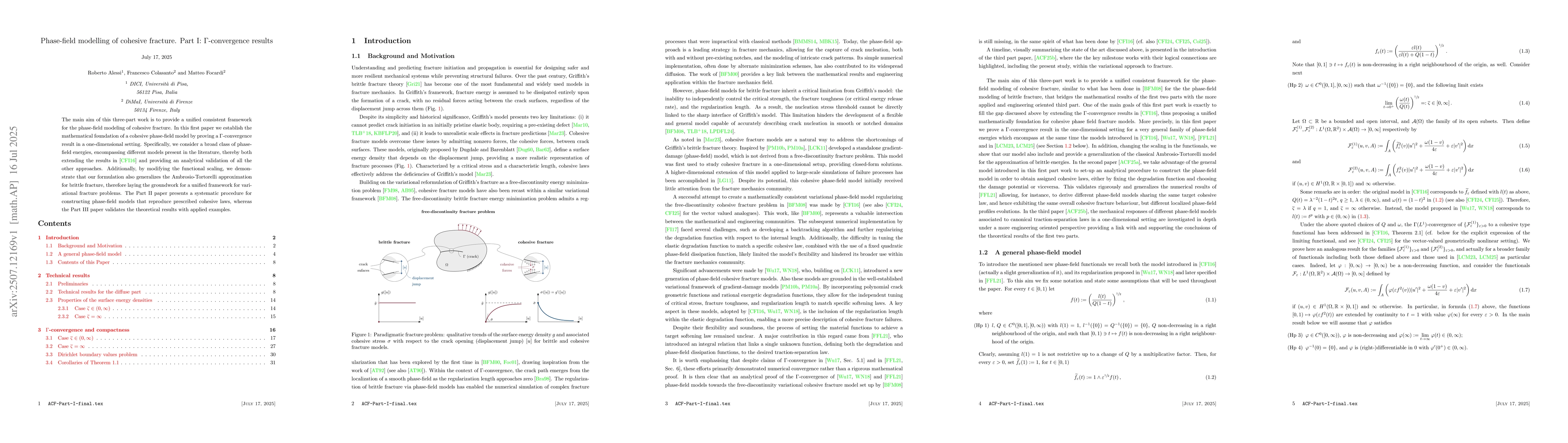 The main aim of this three-part work is to provide a unified consistent framework for the phase-field modeling of cohesive fracture. In this first paper we establish the mathematical foundation of a cohesive phase-field model by proving a $\Gamma$-convergence result in a one-dimensional setting. Specifically, we consider a broad class of phase-field energies, encompassing different models present in the literature, thereby both extending the results in \cite{ContiFocardiIurlano2016} and providing an analytical validation of all the other approaches. Additionally, by modifying the functional scaling, we demonstrate that our formulation also generalizes the Ambrosio-Tortorelli approximation for brittle fracture, therefore laying the groundwork for a unified framework for variational fracture problems. The Part~II paper presents a systematic procedure for constructing phase-field models that reproduce prescribed cohesive laws, whereas the Part~III paper validates the theoretical results with applied examples.
