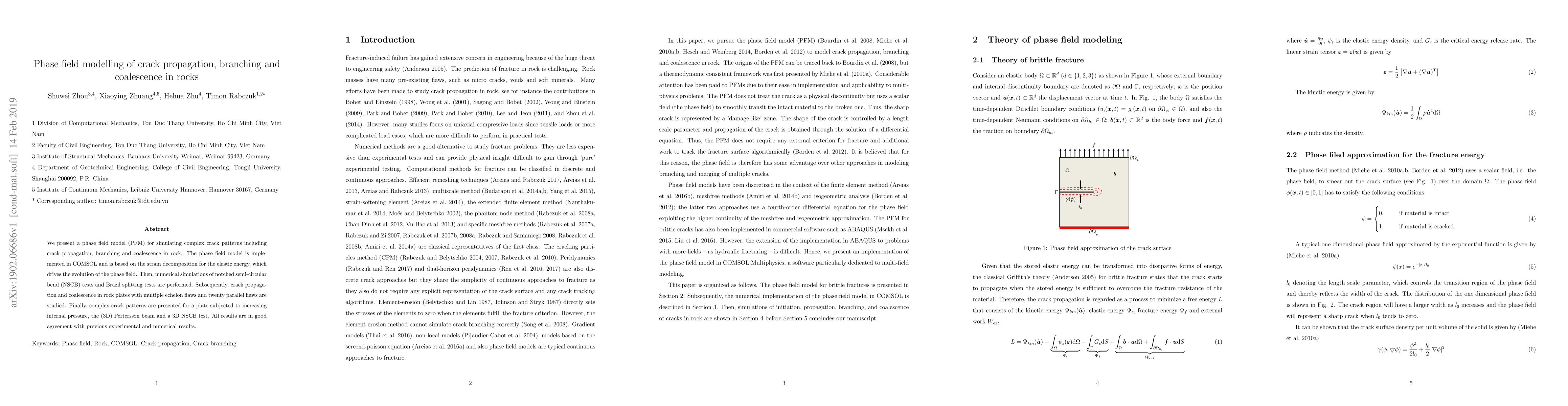This paper introduces a phase field model (PFM) for simulating crack propagation, branching, and coalescence in rock, implemented in COMSOL. The model's accuracy is validated through simulations of various tests, showing good agreement with experimental and previous numerical results.
