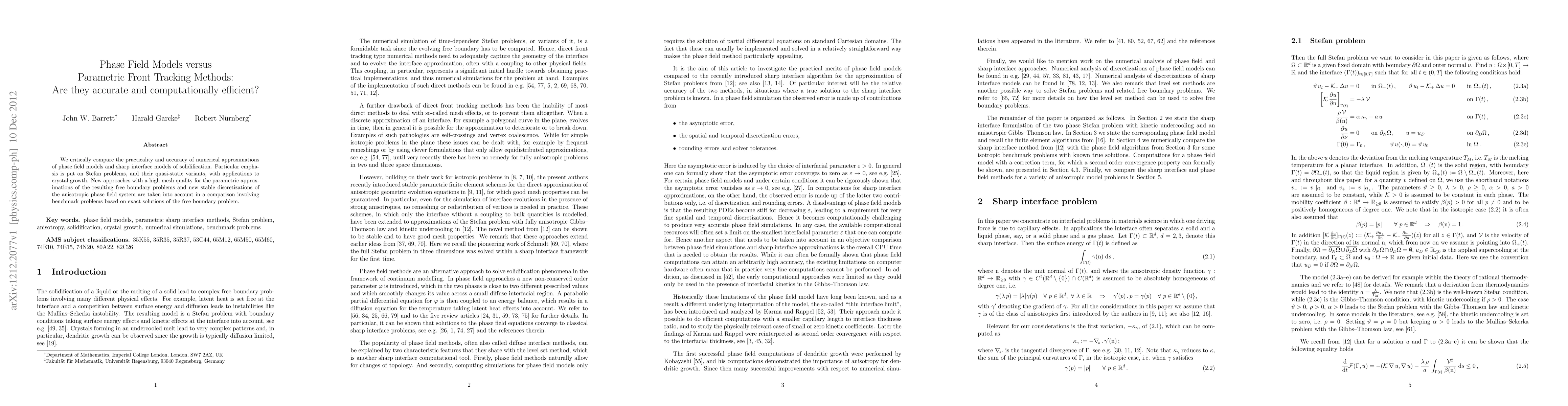 This paper critically compares phase field models and parametric front tracking methods for solidification processes, focusing on the accuracy and computational efficiency of numerical approximations, particularly for Stefan problems and their quasi-static variants in crystal growth. It introduces new approaches for mesh quality and stable discretizations, and evaluates them against benchmark problems.