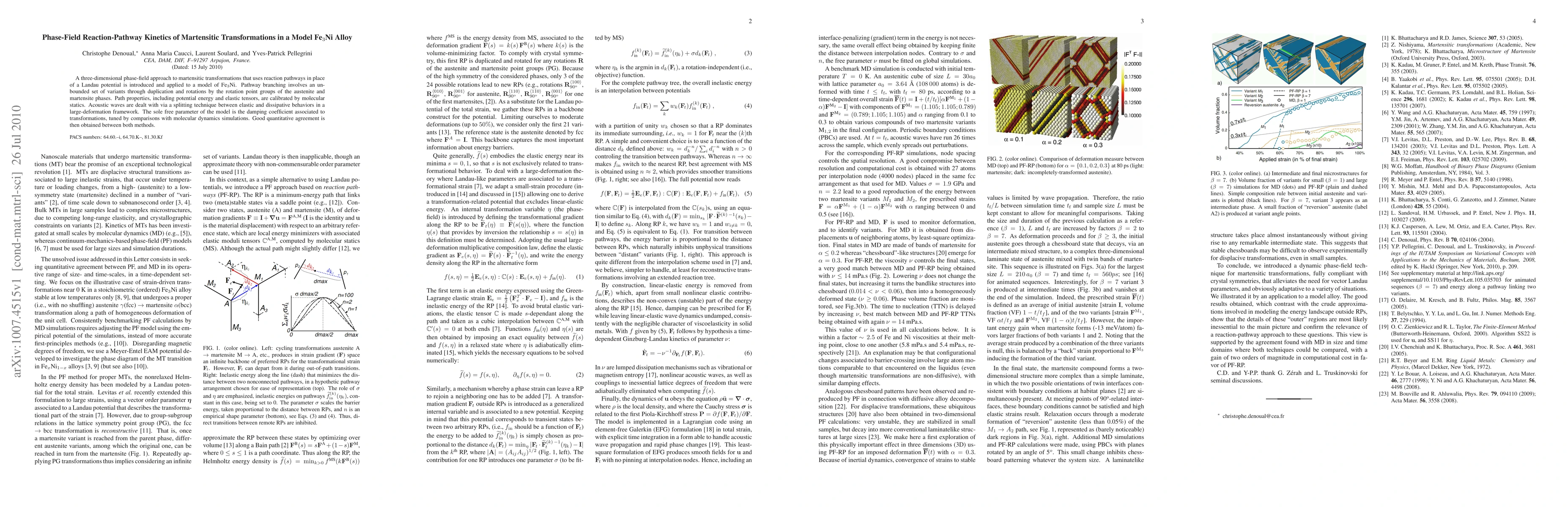 A three-dimensional phase-field approach to martensitic transformations that uses reaction pathways in place of a Landau potential is introduced and applied to a model of Fe3Ni. Pathway branching involves an unbounded set of variants through duplication and rotations by the rotation point groups of the austenite and martensite phases. Path properties, including potential energy and elastic tensors, are calibrated by molecular statics. Acoustic waves are dealt with via a splitting technique between elastic and dissipative behaviors in a large-deformation framework. The sole free parameter of the model is the damping coefficient associated to transformations, tuned by comparisons with molecular dynamics simulations. Good quantitative agreement is then obtained between both methods.