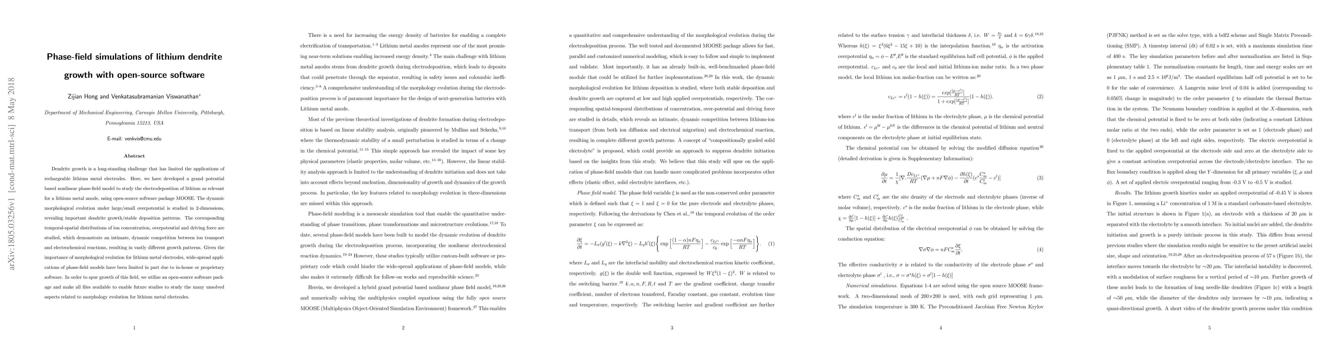 This paper develops a phase-field model using open-source software to simulate lithium dendrite growth in rechargeable lithium metal electrodes, revealing dynamic morphological evolution patterns under varying overpotentials. The study aims to promote further research by making all computational files publicly available.