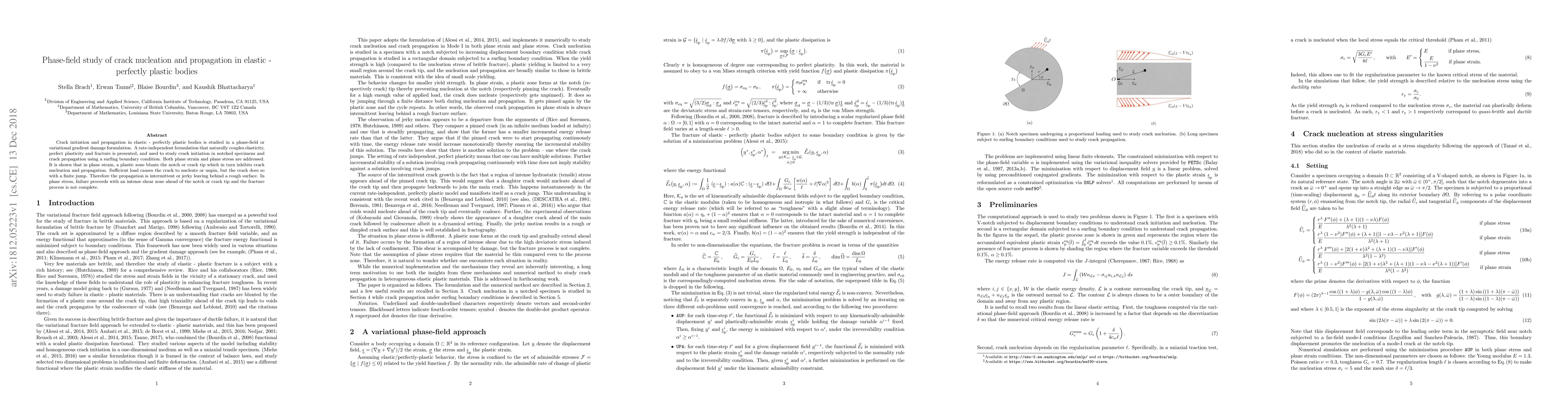 This paper explores crack initiation and propagation using a phase-field model for elastic-perfectly plastic materials, revealing intermittent crack growth in plane strain due to blunting plastic zones, while plane stress leads to intense shear zones and incomplete fracture.