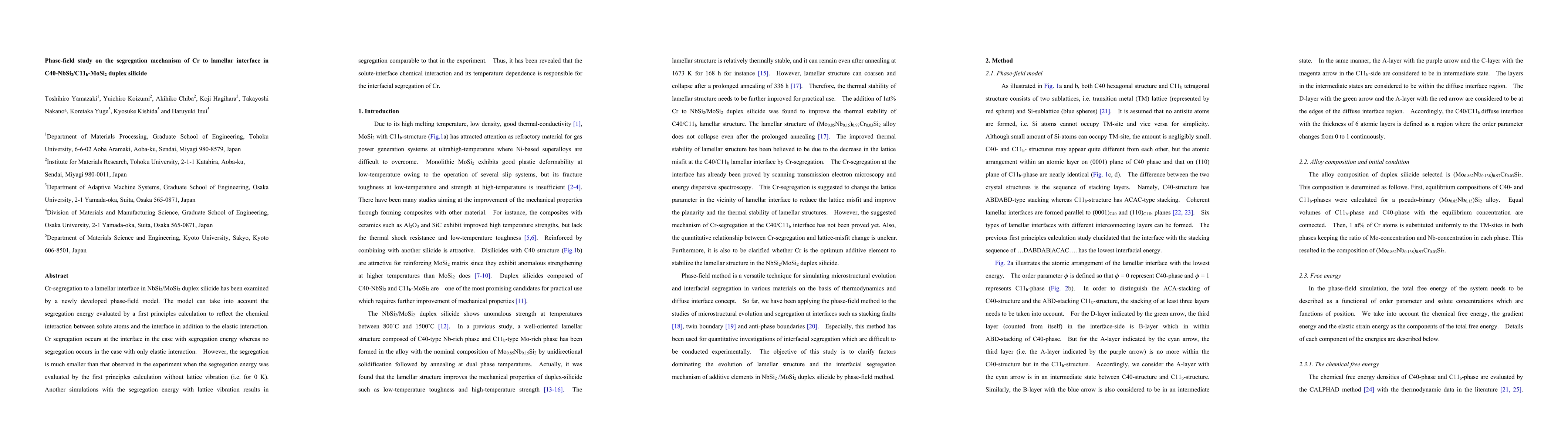 Cr-segregation to a lamellar interface in NbSi2/MoSi2 duplex silicide has been examined by a newly developed phase-field model. The model can take into account the segregation energy evaluated by a first principles calculation to reflect the chemical interaction between solute atoms and the interface in addition to the elastic interaction. Cr segregation occurs at the interface in the case with segregation energy whereas no segregation occurs in the case with only elastic interaction. However, the segregation is much smaller than that observed in the experiment when the segregation energy was evaluated by the first principles calculation without lattice vibration (i.e. for 0 K). Another simulations with the segregation energy with lattice vibration results in segregation comparable to that in the experiment. Thus, it has been revealed that the solute-interface chemical interaction and its temperature dependence is responsible for the interfacial segregation of Cr.