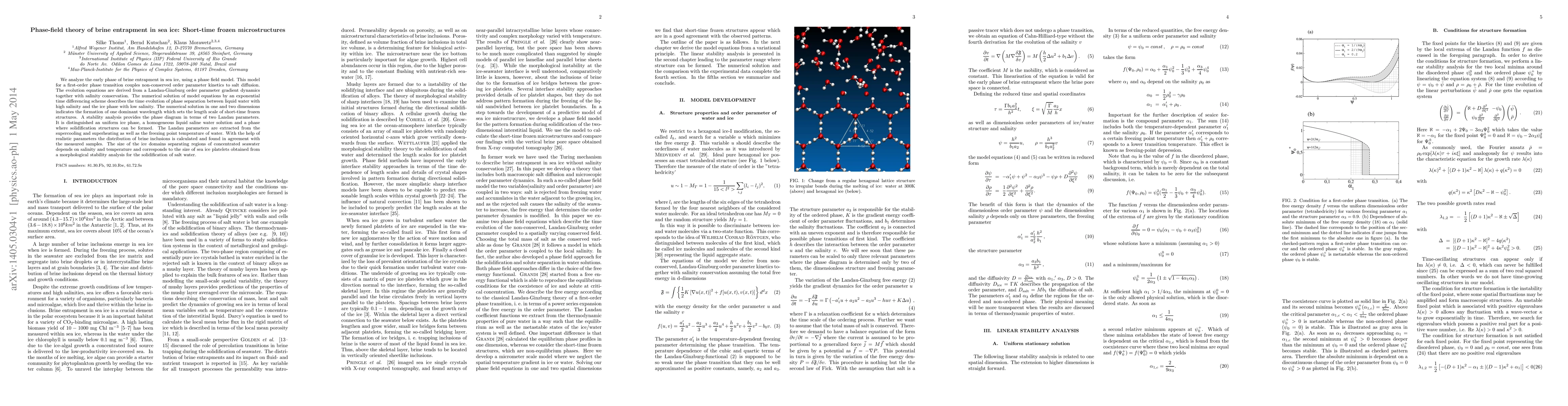 This paper employs a phase-field model to study the early phase of brine entrapment in sea ice, revealing the formation of dominant wavelength structures and the dependence of ice domain size on salinity and temperature. The model's numerical solution aligns with measured brine inclusion distributions, providing insights into the stability and morphology of sea ice.