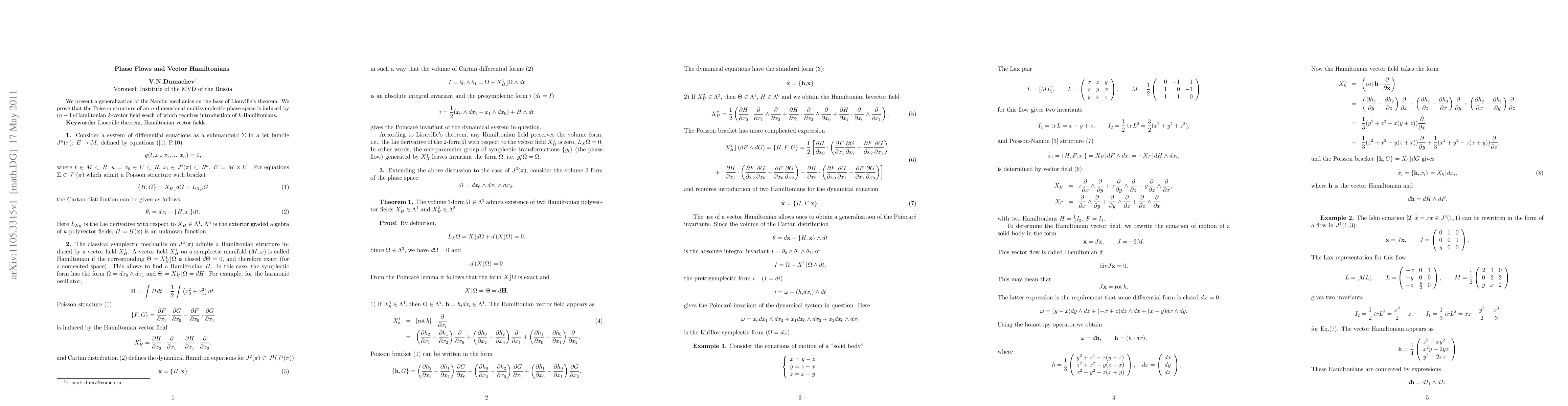 We present a generalization of the Nambu mechanics on the base of Liouville's theorem. We prove that the Poisson structure of an n-dimensional multisymplectic phase space is induced by (n-1)-Hamiltonian k-vector field seach of which requires introduction of k-Hamiltonians.
