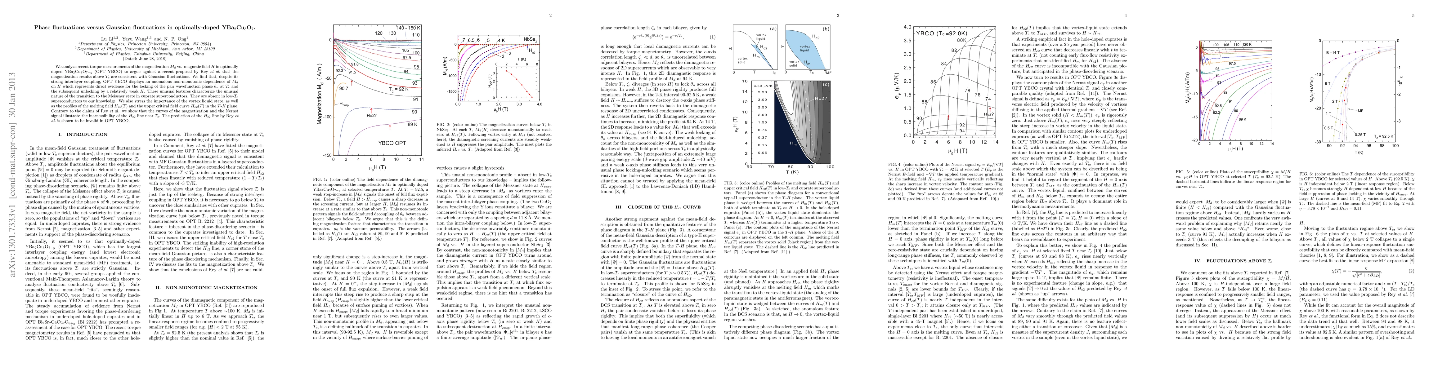 We analyze recent torque measurements of the magnetization $M_d$ vs. magnetic field $H$ in optimally doped YBa$_2$Cu$_3$O$_{7-y}$ (OPT YBCO) to argue against a recent proposal by Rey et al that the magnetization results above $T_c$ are consistent with Gaussian fluctuations. We find that, despite its strong interlayer coupling, OPT YBCO displays an anomalous non-monotonic dependence of $M_d$ on $H$ which represents direct evidence for the locking of the pair wavefunction phase $\theta_n$ at $T_c$ and the subsequent unlocking by a relatively weak $H$. These unusual features characterize the unusual nature of the transition to the Meissner state in cuprate superconductors. They are absent in low-$T_c$ superconductors to our knowledge. We also stress the importance of the vortex liquid state, as well as the profiles of the melting field $H_m(T)$ and the upper critical field curve $H_{c2}(T)$ in the $T$-$H$ plane. Contrary to the claims of Rey et al, we show that the curves of the magnetization and the Nernst signal illustrate the inaccessibility of the $H_{c2}$ line near $T_c$. The prediction of the $H_{c2}$ line by Rey et al is shown to be invalid in OPT YBCO.