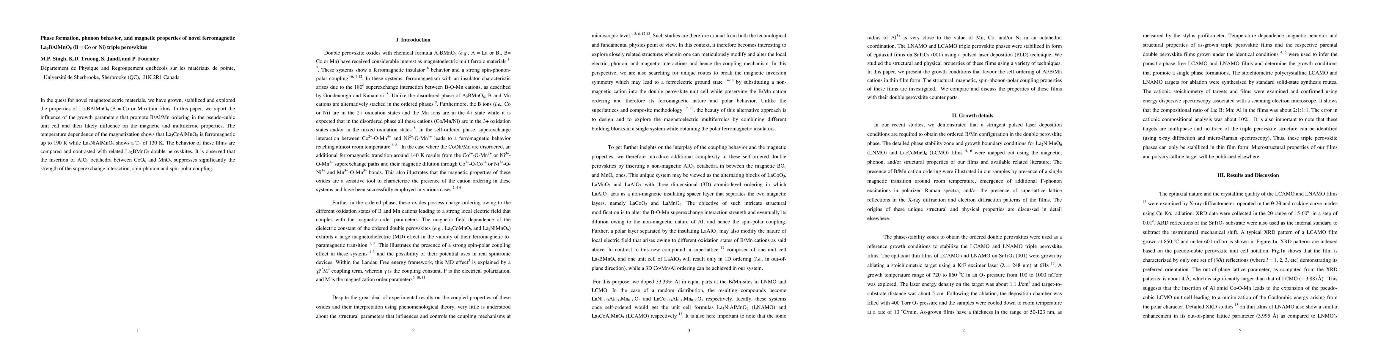In the quest for novel magnetoelectric materials, we have grown, stabilized and explored the properties of La3BAlMnO9 (B = Co or Mn) thin films. In this paper, we report the influence of the growth parameters that promote B/Al/Mn ordering in the pseudo-cubic unit cell and their likely influence on the magnetic and multiferroic properties. The temperature dependence of the magnetization shows that La3CoAlMnO9 is ferromagnetic up to 190 K while La3NiAlMnO9 shows a TC of 130 K. The behavior of these films are compared and contrasted with related La2BMnO6 double perovskites. It is observed that the insertion of AlO6 octahedra between CoO6 and MnO6 suppresses significantly the strength of the superexchange interaction, spin-phonon and spin-polar coupling.
