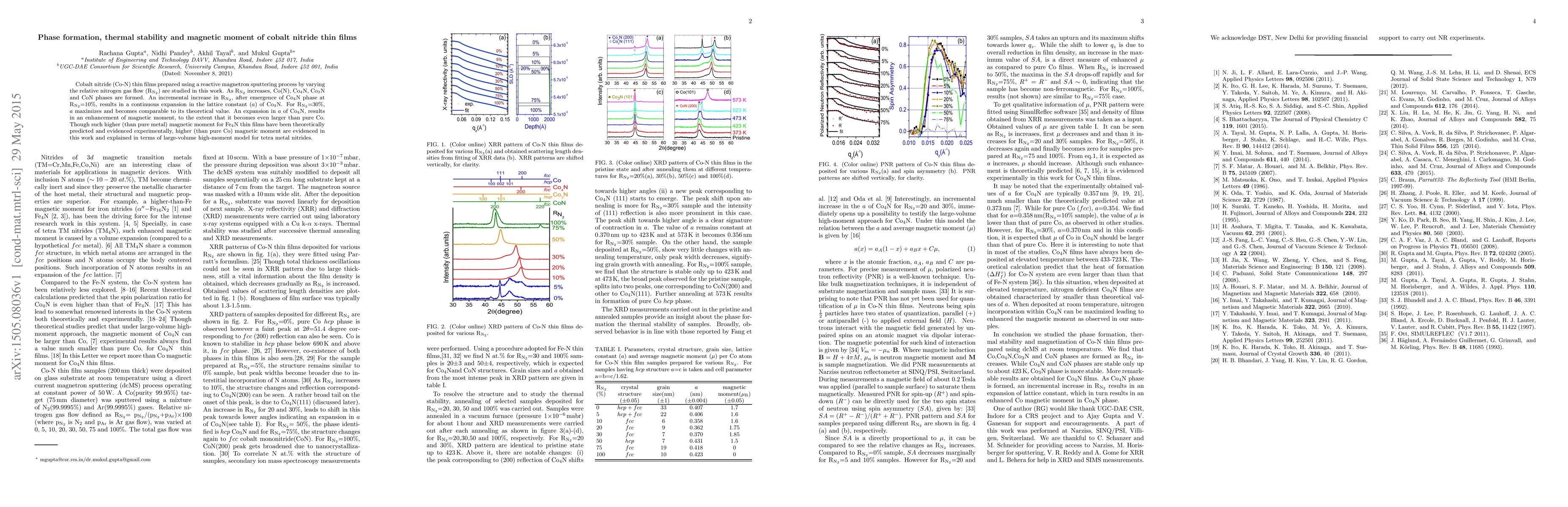 This study investigates cobalt nitride thin films prepared via reactive magnetron sputtering, revealing phase formation and thermal stability changes with varying nitrogen gas flow. Enhanced magnetic moments are observed, surpassing those of pure cobalt, explained by a large-volume high-moment model for tetra metal nitrides.