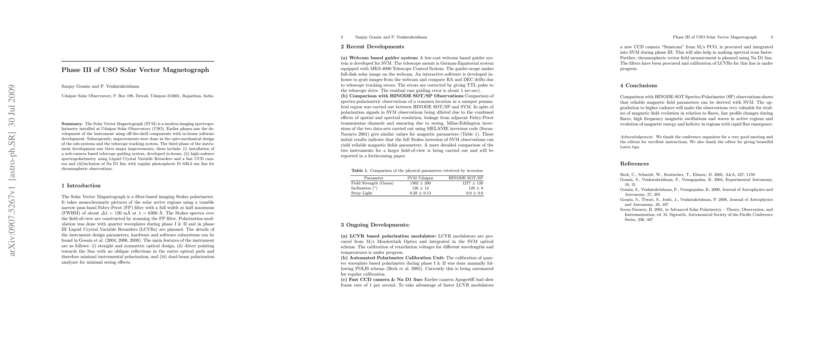 The Phase III of the USO Solar Vector Magnetograph introduced three major enhancements: an in-house web-camera based telescope guiding system, high-cadence spectropolarimetry with Liquid Crystal Variable Retarders and a fast CCD camera, and the addition of Na D1 line observations alongside the regular Fe 630.2 nm line for chromospheric studies.
