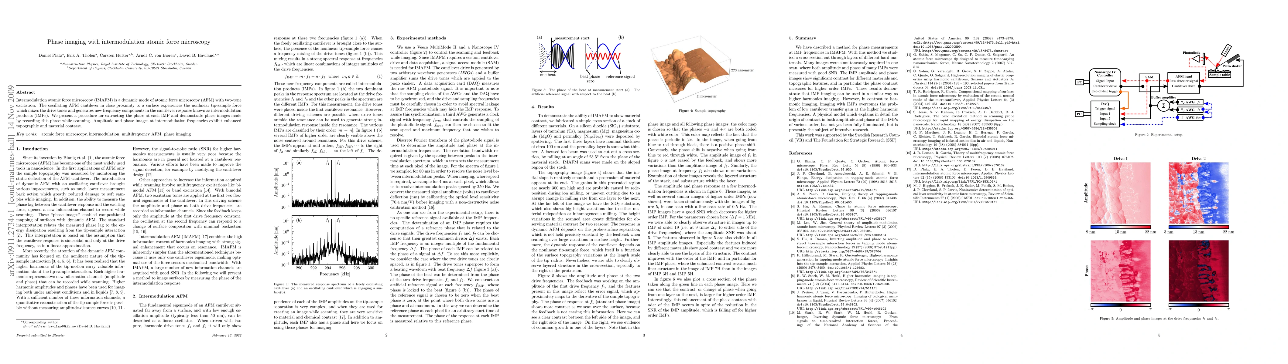 Intermodulation atomic force microscopy (IMAFM) employs two-tone excitation to extract phase information from nonlinear tip-sample interactions, providing enhanced topographic and material contrast in phase images. The method reveals new frequency components, or intermodulation products, which improve image resolution and material differentiation.
