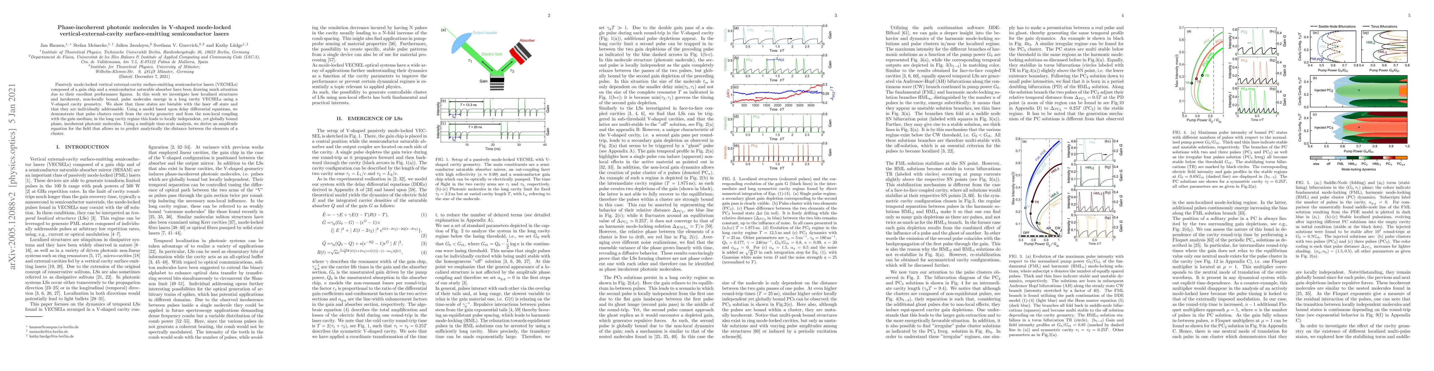 Passively mode-locked vertical external-cavity surface-emitting semiconductor lasers (VECSELs) composed of a gain chip and a semiconductor saturable absorber have been drawing much attention due to their excellent performance figures. In this work we investigate how localized structures and incoherent, non-locally bound, pulse molecules emerge in a long cavity VECSELs using a V-shaped cavity geometry. We show that these states are bistable with the laser off state and that they are individually addressable. Using a model based upon delay differential equations, we demonstrate that pulse clusters result from the cavity geometry and from the non-local coupling with the gain medium; this leads to locally independent, yet globally bound phase, incoherent photonic molecules. Using a multiple time-scale analysis, we derive an amplitude equation for the field that allows us to predict analytically the distance between the elements of a cluster.