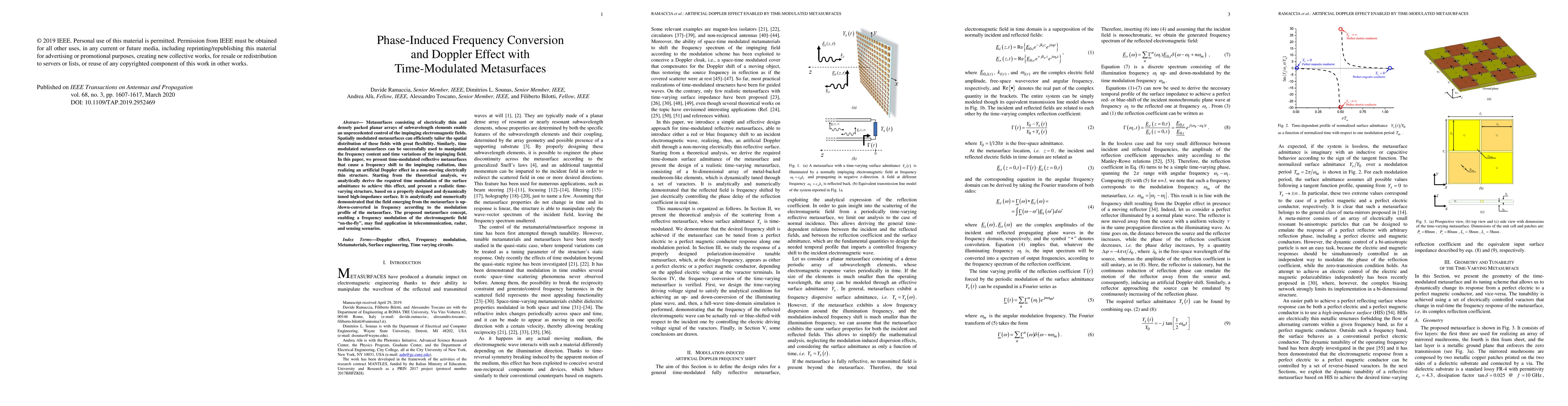 This paper explores time-modulated reflective metasurfaces that induce a frequency shift in impinging electromagnetic radiation, mimicking an artificial Doppler effect in a stationary structure. The study analytically derives the necessary time modulation of surface admittance and demonstrates the frequency conversion through a dynamically tuned high-impedance surface.