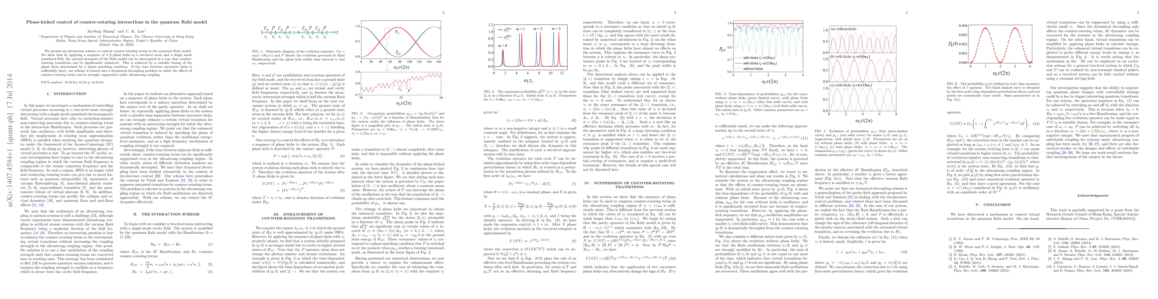 This paper proposes a phase-kicked control method to enhance counter-rotating interactions in the quantum Rabi model by applying timed $\pi/2$ phase kicks. The scheme effectively suppresses counter-rotating effects under ultrastrong coupling through a dynamical decoupling approach.