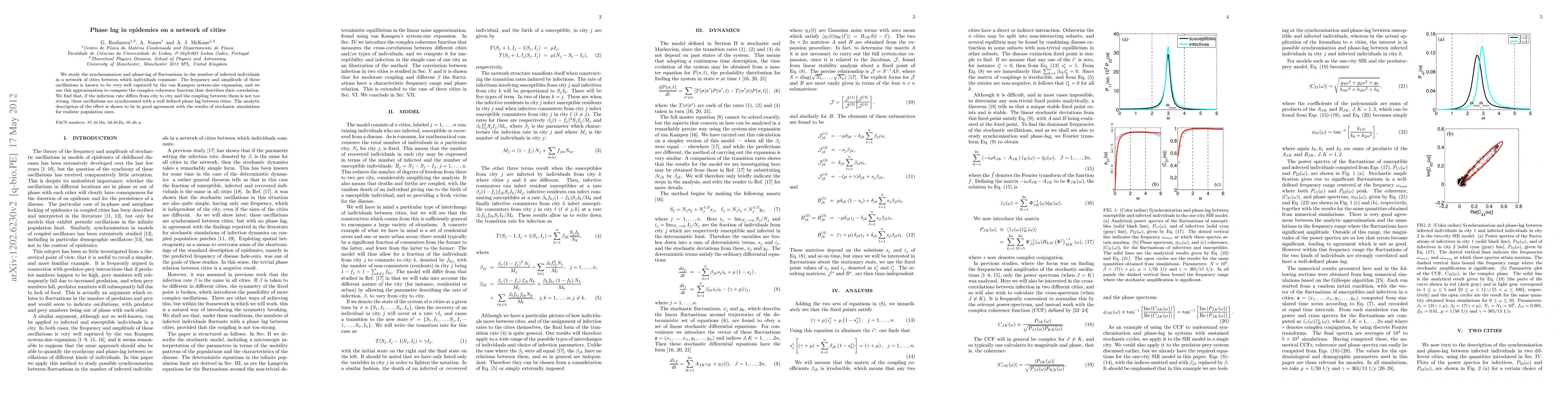 We study the synchronisation and phase-lag of fluctuations in the number of infected individuals in a network of cities between which individuals commute. The frequency and amplitude of these oscillations is known to be very well captured by the van Kampen system-size expansion, and we use this approximation to compute the complex coherence function that describes their correlation. We find that, if the infection rate differs from city to city and the coupling between them is not too strong, these oscillations are synchronised with a well defined phase lag between cities. The analytic description of the effect is shown to be in good agreement with the results of stochastic simulations for realistic population sizes.
