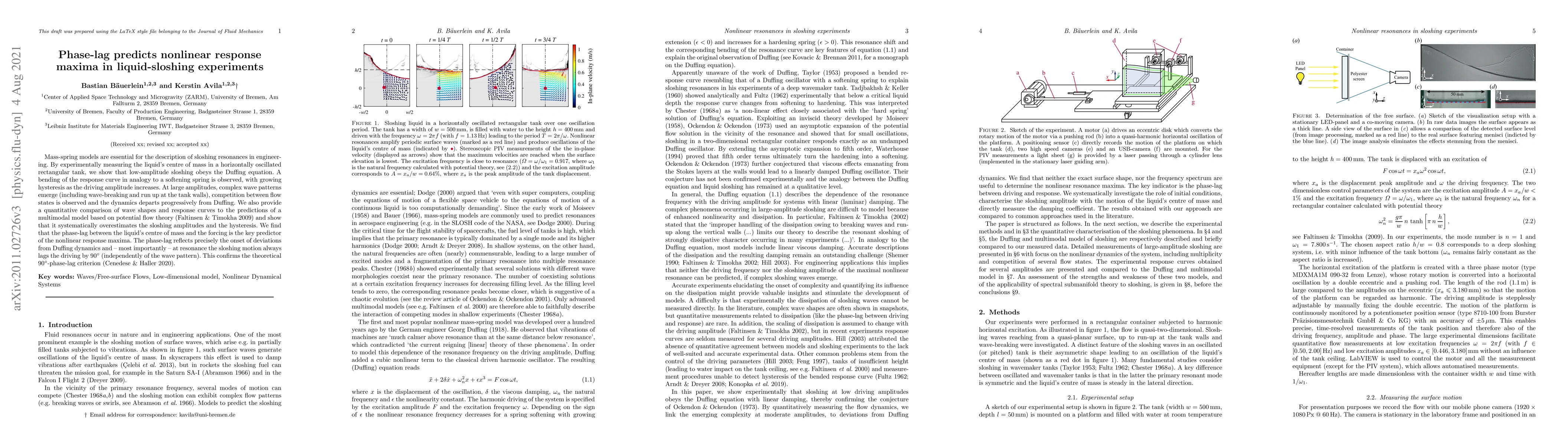 This paper demonstrates that low-amplitude liquid sloshing in a horizontally oscillated tank follows the Duffing equation, with phase-lag predicting nonlinear response maxima. At resonance, the liquid's centre of mass always lags the driving force by 90°, confirming theoretical predictions.