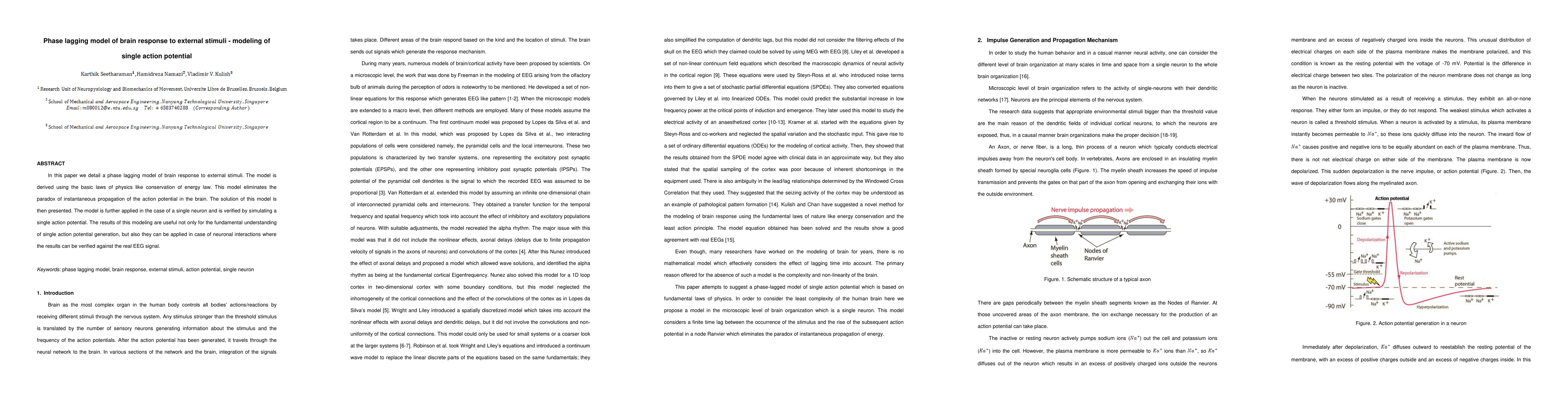 This paper proposes a phase lagging model of brain response to external stimuli, derived from conservation of energy principles, to explain the propagation of single action potentials without instantaneous transmission. The model is validated through simulation of a single action potential and has potential applications in understanding neuronal interactions and verifying EEG signals.