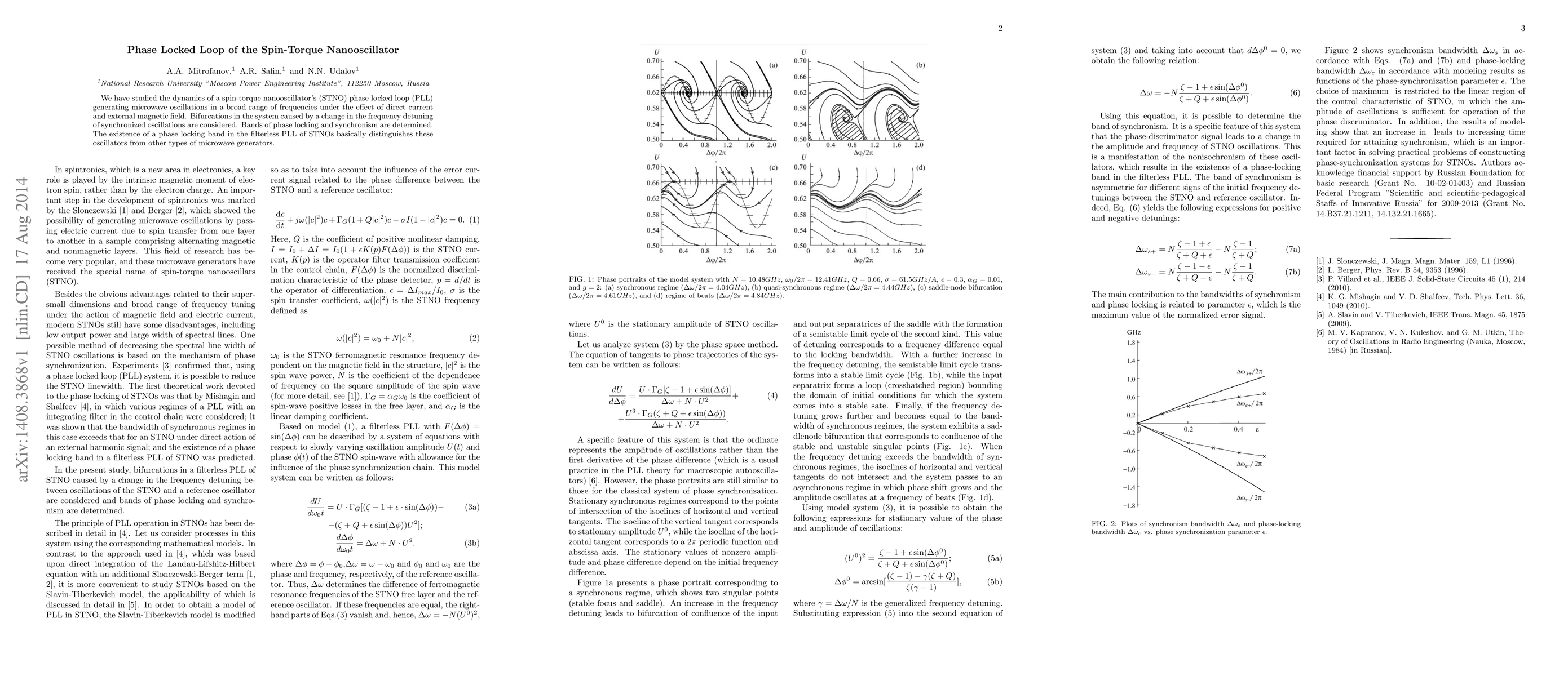This paper investigates the phase locked loop dynamics of spin-torque nanooscillators (STNOs) generating microwave oscillations, identifying bifurcations and determining bands of phase locking and synchronism under varying current and magnetic field conditions. The study highlights the unique phase locking band in the filterless PLL of STNOs, distinguishing them from other microwave generators.