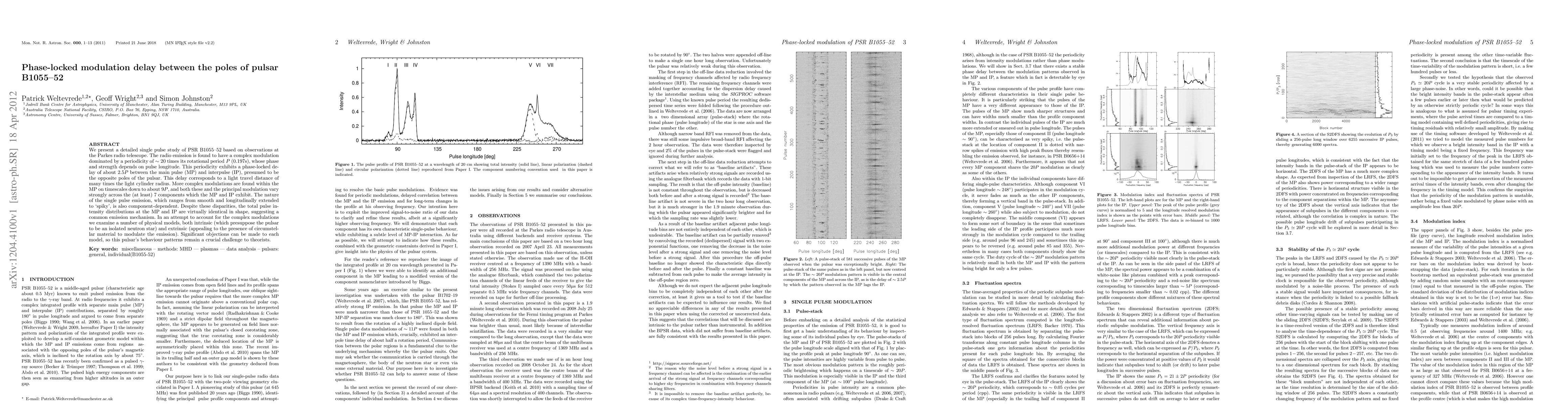 We present a detailed single pulse study of PSR B1055-52 based on observations at the Parkes radio telescope. The radio emission is found to have a complex modulation dominated by a periodicity of ~20 times its rotational period P (0.197s), whose phase and strength depends on pulse longitude. This periodicity exhibits a phase-locked delay of about 2.5P between the main pulse (MP) and interpulse (IP), presumed to be the opposite poles of the pulsar. This delay corresponds to a light travel distance of many times the light cylinder radius. More complex modulations are found within the MP on timescales down to about 9P, and both these and the principal modulation vary strongly across the (at least) 7 components which the MP and IP exhibit. The nature of the single pulse emission, which ranges from smooth and longitudinally extended to `spiky', is also component-dependent. Despite these disparities, the total pulse intensity distributions at the MP and IP are virtually identical in shape, suggesting a common emission mechanism. In an attempt to account for the complex modulations we examine a number of physical models, both intrinsic (which presuppose the pulsar to be an isolated neutron star) and extrinsic (appealing to the presence of circumstellar material to modulate the emission). Significant objections can be made to each model, so this pulsar's behaviour patterns remain a crucial challenge to theorists.