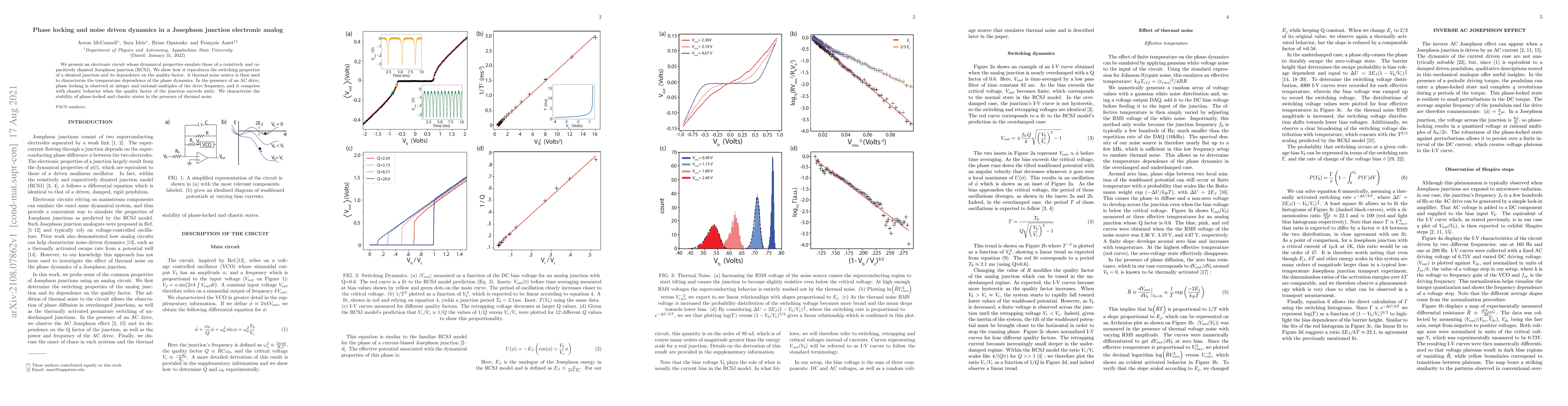 This paper describes an electronic circuit emulating a Josephson junction, demonstrating its switching behavior and temperature dependence. It observes phase locking at various drive frequencies amidst chaotic dynamics when the quality factor exceeds one, and analyzes the stability of these states under thermal noise.