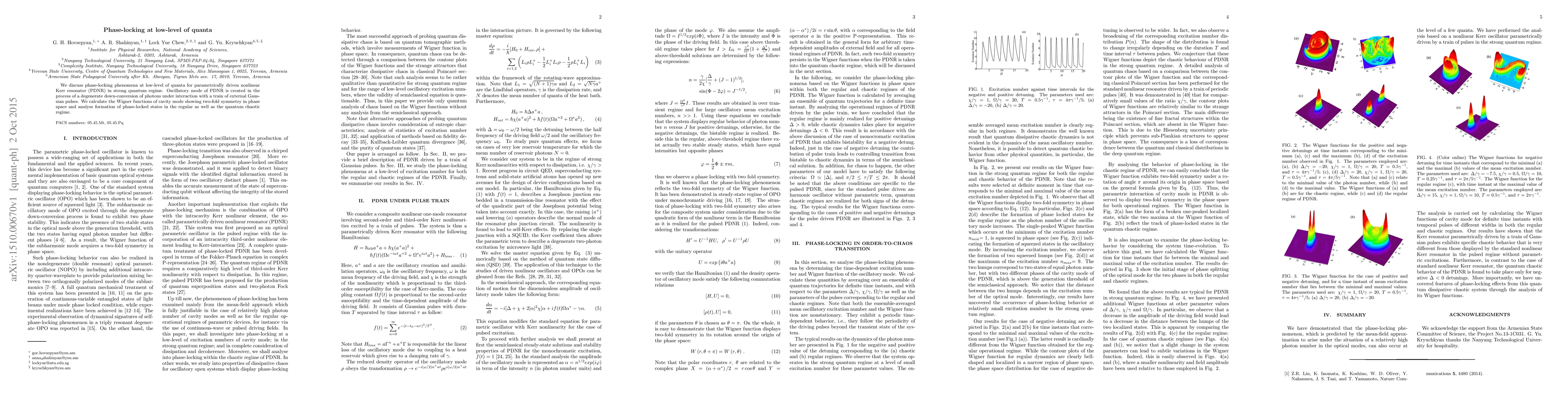 We discuss phase-locking phenomena at low-level of quanta for parametrically driven nonlinear Kerr resonator (PDNR) in strong quantum regime. Oscillatory mode of PDNR is created in the process of a degenerate down-conversion of photons under interaction with a train of external Gaussian pulses. We calculate the Wigner functions of cavity mode showing two-fold symmetry in phase space and analyse formation of phase-locked states in the regular as well as the quantum chaotic regime.