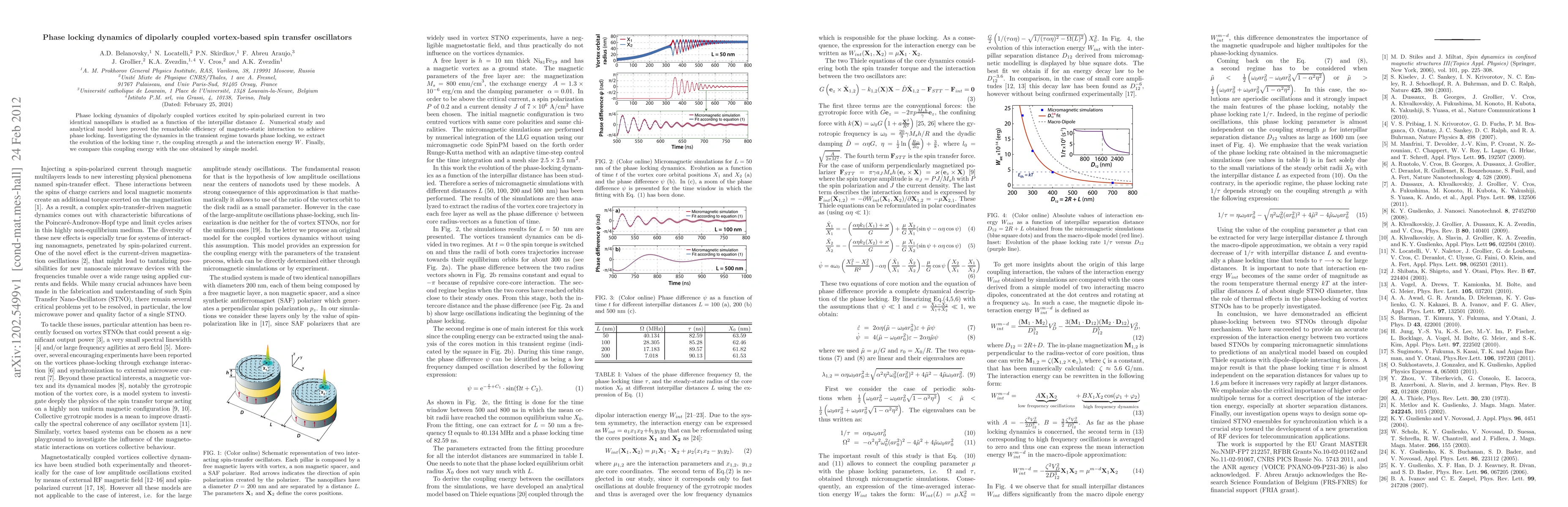 This paper investigates the phase locking dynamics of dipolarly coupled vortex-based spin transfer oscillators in nanopillars, demonstrating the efficiency of magneto-static interaction for achieving phase locking. The study extracts the evolution of locking time, coupling strength, and interaction energy, comparing the results with a simple model.