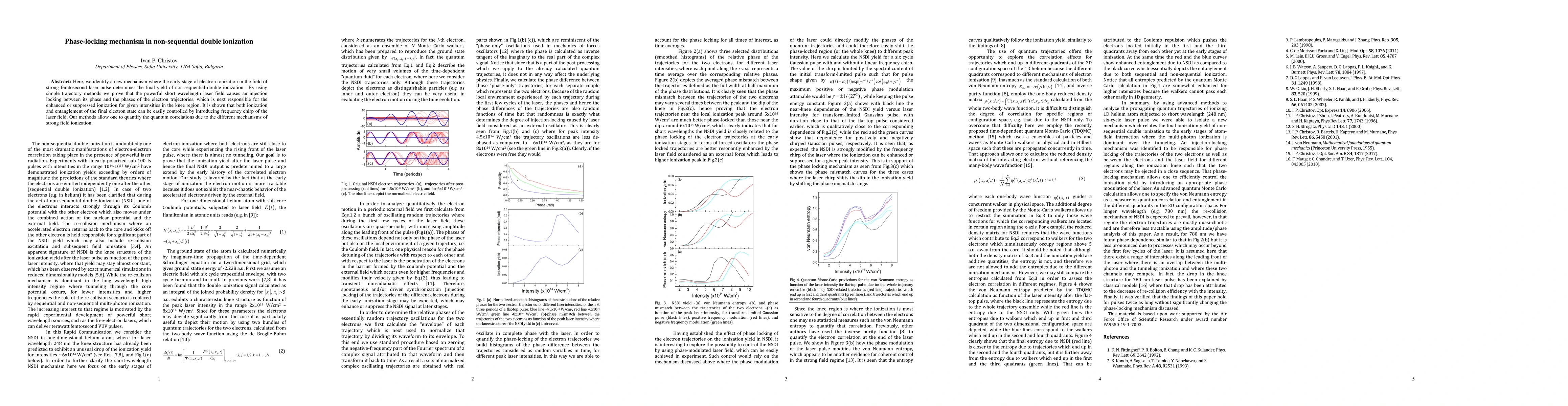 This paper identifies a phase-locking mechanism in non-sequential double ionization where the early electron ionization stage in a strong femtosecond laser field determines the final ionization yield. The study demonstrates that the laser field induces an injection locking between its phase and electron trajectories, which can enhance or suppress ionization, and that frequency chirp of the laser field can control ionization and entanglement of the final electron state.