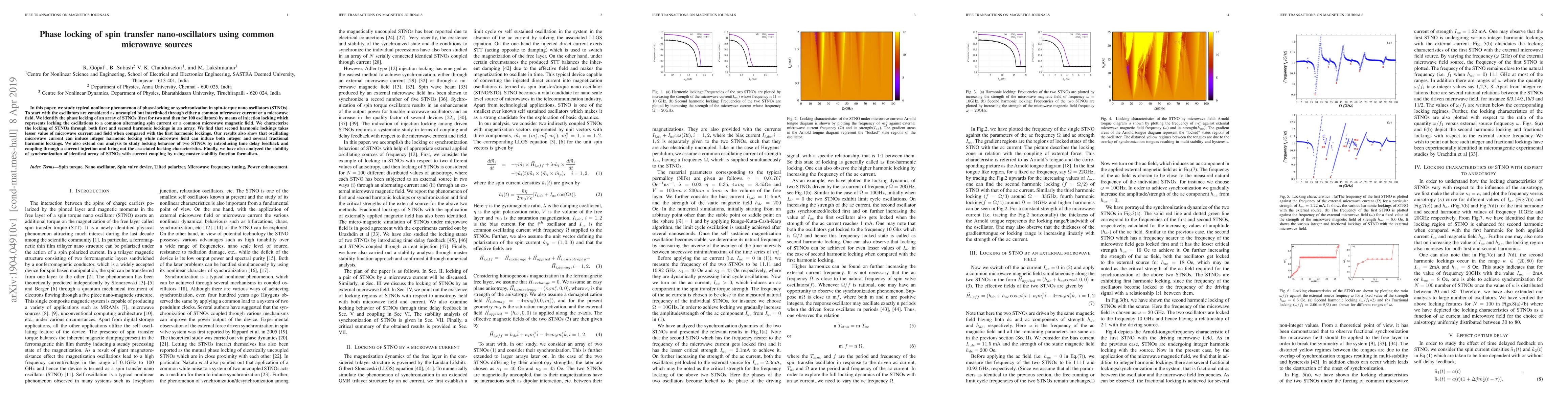 This paper investigates the phase-locking phenomenon in spin-torque nano oscillators (STNOs) using common microwave sources, demonstrating synchronization through injection locking and analyzing both first and second harmonic lockings. The study reveals that second harmonic lockings require lower microwave current and field, and explores the effects of time delay feedback and current coupling on synchronization stability.