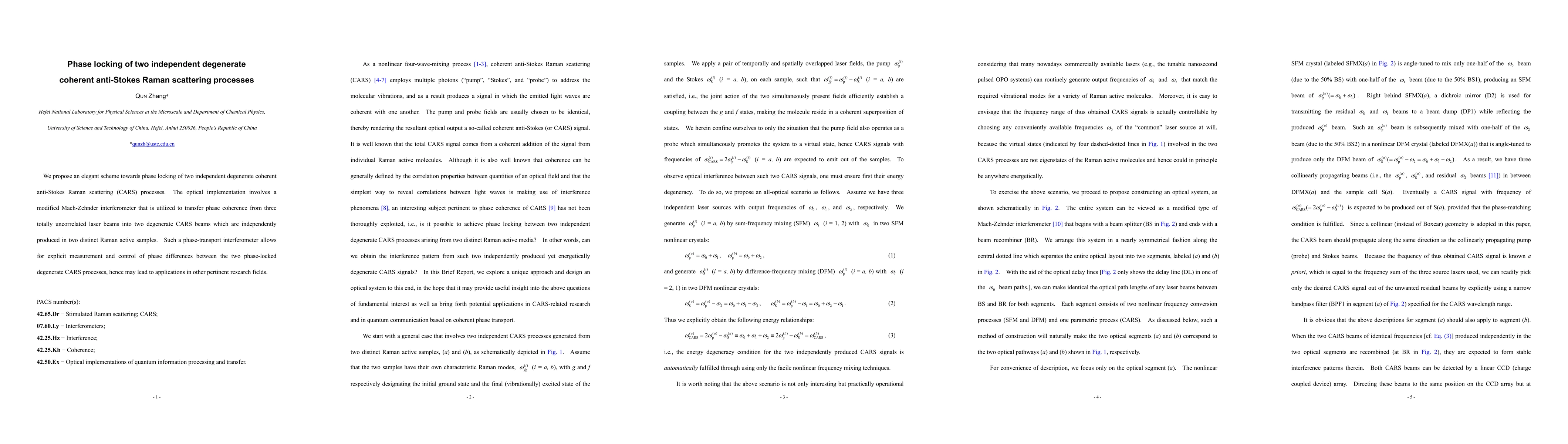 Researchers propose a method to phase-lock two independent degenerate coherent anti-Stokes Raman scattering processes using a modified Mach-Zehnder interferometer, enabling explicit measurement and control of phase differences.