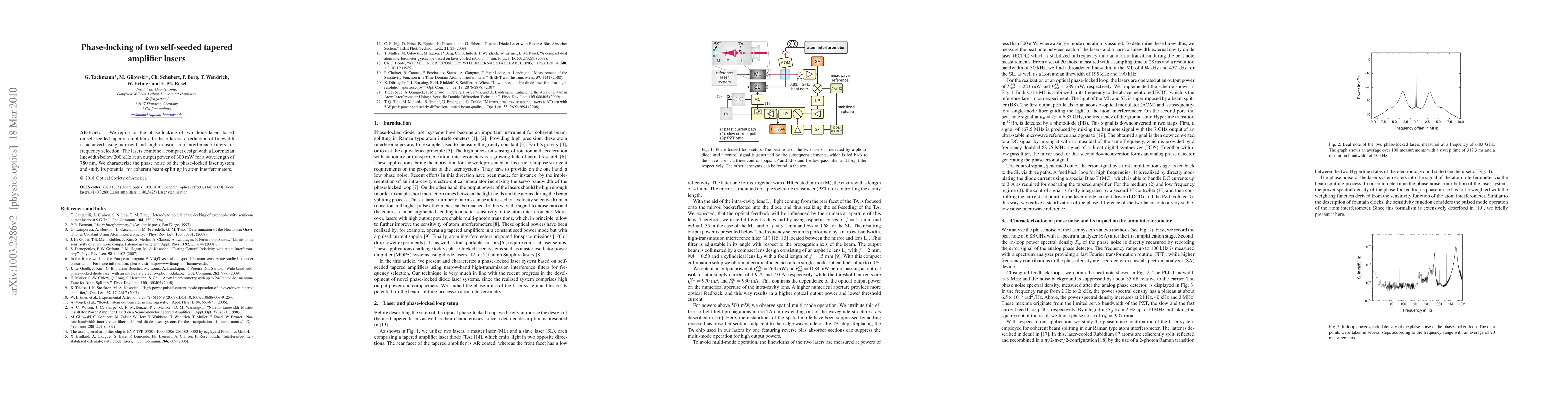 The paper reports the first phase-locking of two self-seeded tapered amplifier lasers using an interference filter for frequency selection, providing single-mode optical output power up to 300 mW each with a free-running Lorentzian linewidth below 200 kHz.