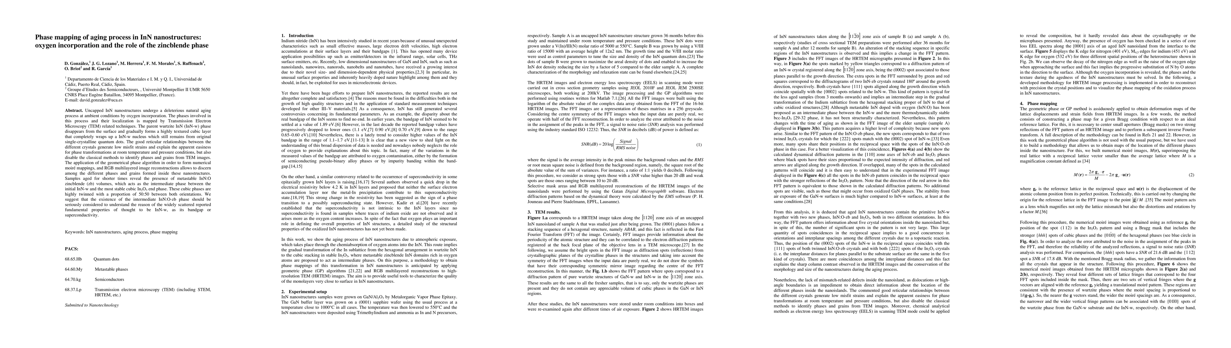 This study maps the aging process of uncapped InN nanostructures, revealing oxygen incorporation leading to phase transformation from wurtzite to a cubic zincblende phase. Advanced TEM techniques identify an intermediate metastable InN:O zincblende phase, which may explain discrepancies in reported properties of InN nanostructures.