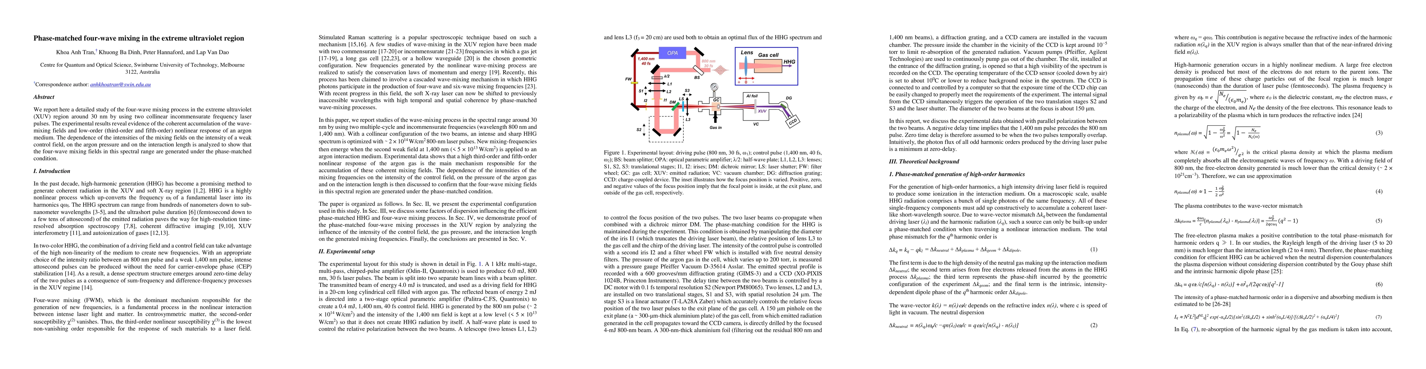 This study demonstrates phase-matched four-wave mixing in the extreme ultraviolet region, achieving coherent wave-mixing fields using two laser pulses in argon gas. The findings indicate a low-order nonlinear response and dependence on control field intensity, gas pressure, and interaction length.