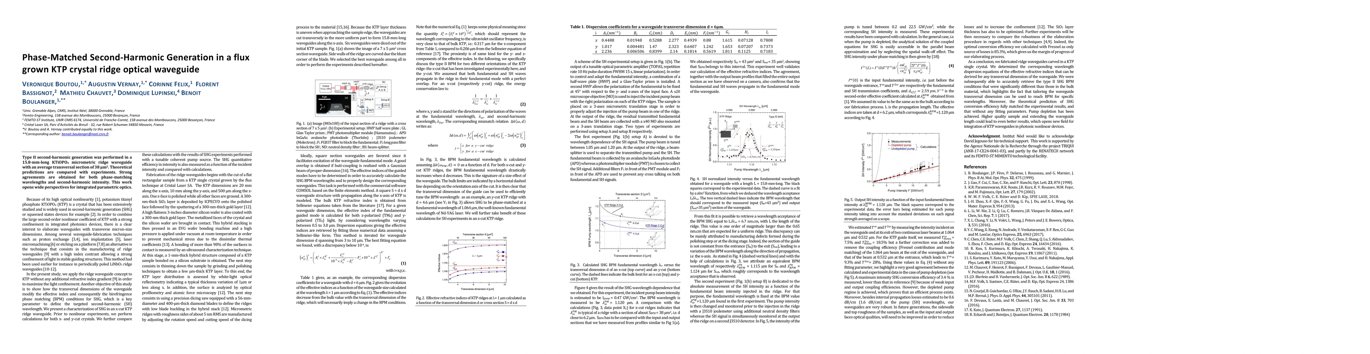 This study investigates phase-matched second-harmonic generation in a KTiOPO4 ridge optical waveguide, achieving strong agreement between theoretical predictions and experimental results, which suggests promising applications for integrated parametric optics.