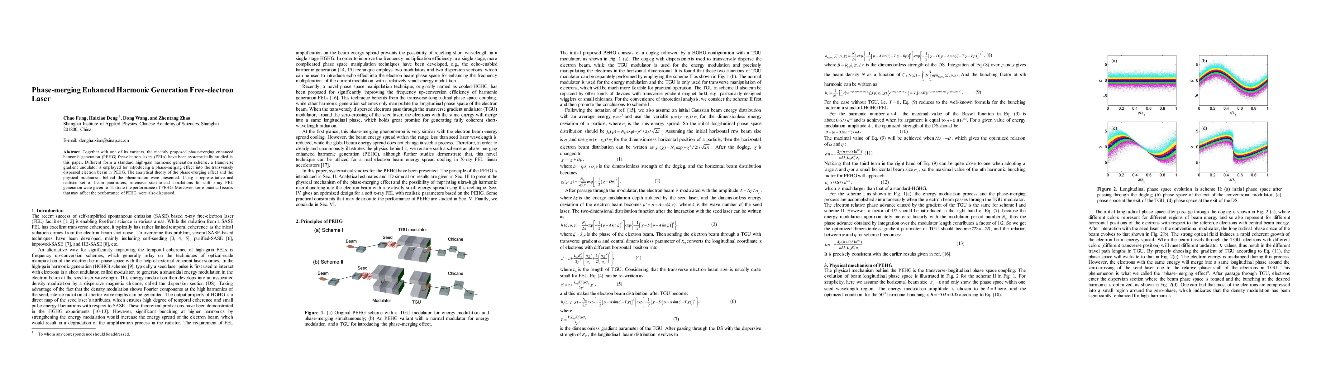 This paper investigates phase-merging enhanced harmonic generation (PEHG) free-electron lasers, employing a transverse gradient undulator to improve electron beam coherence. Analytical theory and simulations demonstrate enhanced soft x-ray FEL performance, alongside discussions on practical implementation challenges.