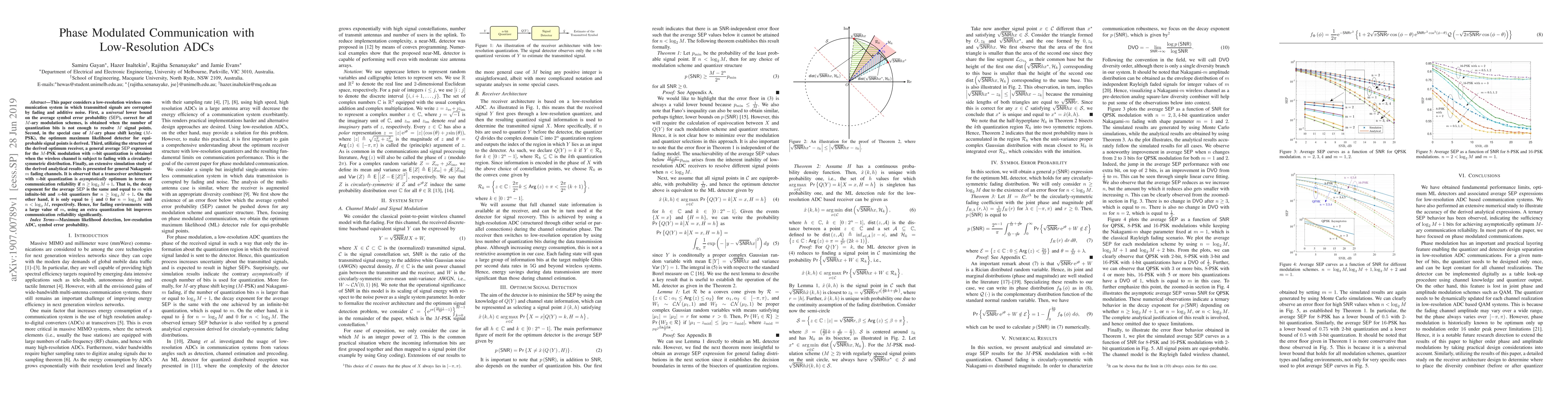 This paper considers a low-resolution wireless communication system in which transmitted signals are corrupted by fading and additive noise. First, a universal lower bound on the average symbol error probability (SEP), correct for all M-ary modulation schemes, is obtained when the number of quantization bits is not enough to resolve M signal points. Second, in the special case of M-ary phase shift keying (M-PSK), the optimum maximum likelihood detector for equiprobable signal points is derived. Third, utilizing the structure of the derived optimum receiver, a general average SEP expression for the M-PSK modulation with n-bit quantization is obtained when the wireless channel is subject to fading with a circularly-symmetric distribution. Finally, an extensive simulation study of the derived analytical results is presented for general Nakagami-m fading channels. It is observed that a transceiver architecture with n-bit quantization is asymptotically optimum in terms of communication reliability if n is greater than or equal to log_2(M +1). That is, the decay exponent for the average SEP is the same and equal to m with infinite-bit and n-bit quantizers for n greater than or equal to log_2(M+1). On the other hand, it is only equal to half and 0 for n = log_2(M) and n < log_2(M), respectively. Hence, for fading environments with a large value of m, using an extra quantization bit improves communication reliability significantly.