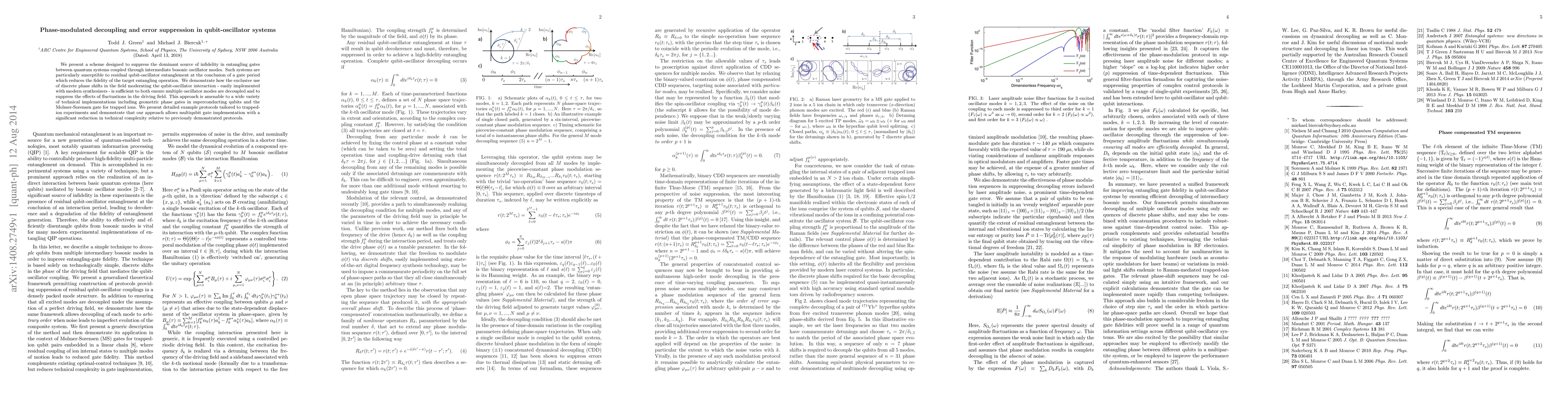 This paper proposes a phase-modulated decoupling scheme to suppress infidelity in entangling gates between qubits coupled via bosonic oscillators, using discrete phase shifts to decouple oscillator modes and reduce field fluctuation effects. The method simplifies multiqubit gate implementation, particularly for trapped-ion systems.