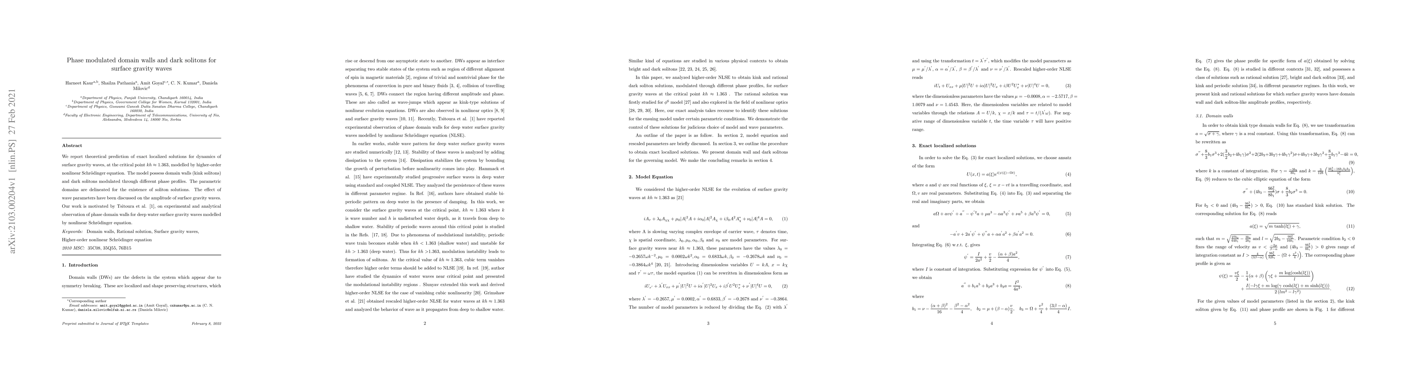 We report theoretical prediction of exact localized solutions for dynamics of surface gravity waves, at the critical point kh=1.363, modelled by higher-order nonlinear Schrodinger equation. The model possess domain walls (kink solitons) and dark solitons modulated through different phase profiles. The parametric domains are delineated for the existence of soliton solutions. The effect of wave parameters have been discussed on the amplitude of surface gravity waves. Our work is motivated by Tsitoura et al. [1], on experimental and analytical observation of phase domain walls for deep water surface gravity waves modelled by nonlinear Schrodinger equation.
