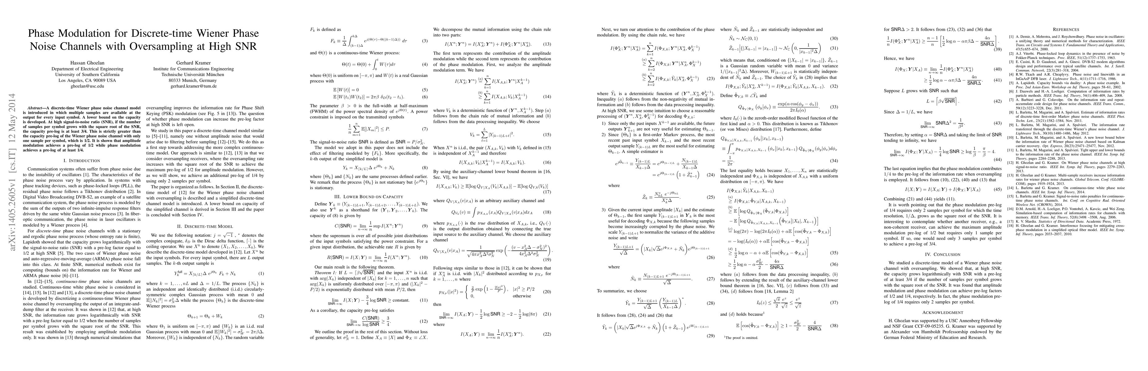 This paper introduces a discrete-time Wiener phase noise channel model with oversampling and develops a lower bound on its capacity. At high SNR, phase modulation achieves a capacity pre-log of at least 3/4, which is superior to the 1/2 pre-log of amplitude modulation.