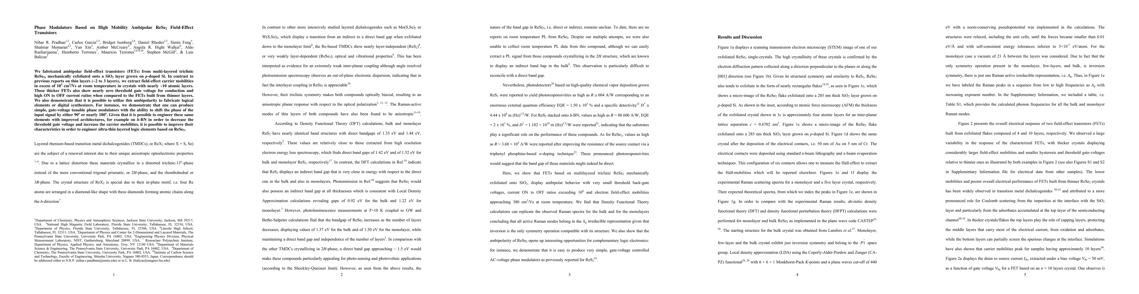 This paper reports on high mobility ambipolar field-effect transistors made from multi-layered ReSe2, demonstrating carrier mobility over 10^2 cm^2/Vs and nearly zero threshold gate voltage. The study also shows the potential for creating gate-voltage tunable phase modulators capable of shifting input signal phase by 90° or nearly 180°, paving the way for advanced logic elements based on ReSe2.