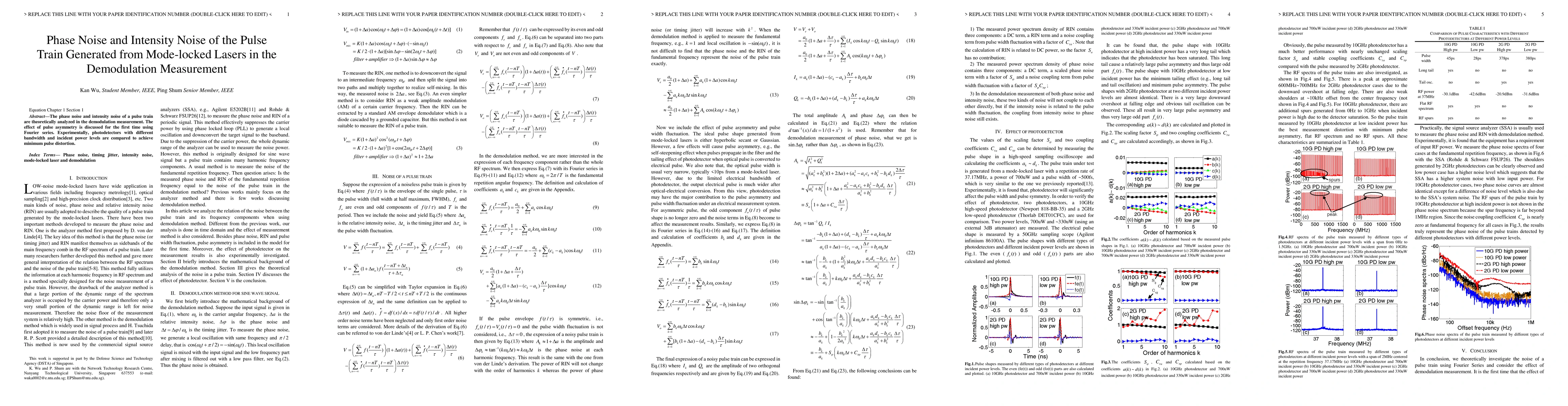 The paper analyzes phase noise and intensity noise in pulse trains from mode-locked lasers during demodulation measurement. It finds that reducing pulse asymmetry using Fourier series analysis helps minimize pulse distortion.