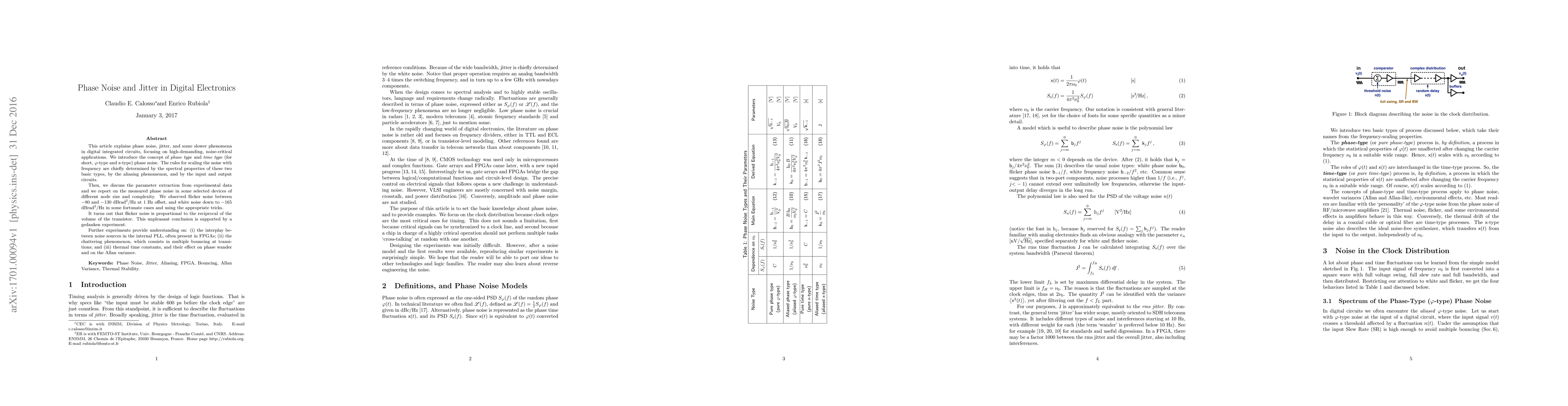 This article explains phase noise, jitter, and some slower phenomena in digital integrated circuits, focusing on high-demanding, noise-critical applications. We introduce the concept of phase type and time type phase noise. The rules for scaling the noise with frequency are chiefly determined by the spectral properties of these two basic types, by the aliasing phenomenon, and by the input and output circuits. Then, we discuss the parameter extraction from experimental data and we report on the measured phase noise in some selected devices of different node size and complexity. We observed flicker noise between -80 and -130 dBrad^2/Hz at 1 Hz offset, and white noise down to -165 dBrad^2/Hz in some fortunate cases and using the appropriate tricks. It turns out that flicker noise is proportional to the reciprocal of the volume of the transistor. This unpleasant conclusion is supported by a gedanken experiment. Further experiments provide understanding on: (i) the interplay between noise sources in the internal PLL, often present in FPGAs; (ii) the chattering phenomenon, which consists in multiple bouncing at transitions; and (iii) thermal time constants, and their effect on phase wander and on the Allan variance.
