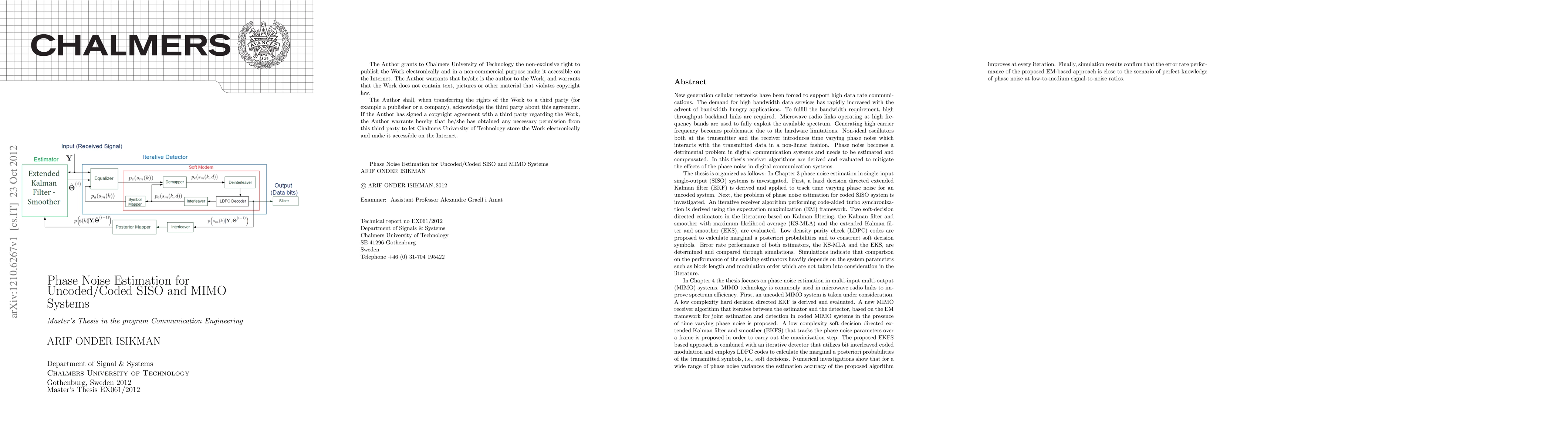 This paper investigates phase noise estimation and mitigation in both single-input single-output (SISO) and multi-input multi-output (MIMO) communication systems. It proposes receiver algorithms for both uncoded and coded systems, including hard and soft decision-based estimators, and evaluates their performance through simulations.