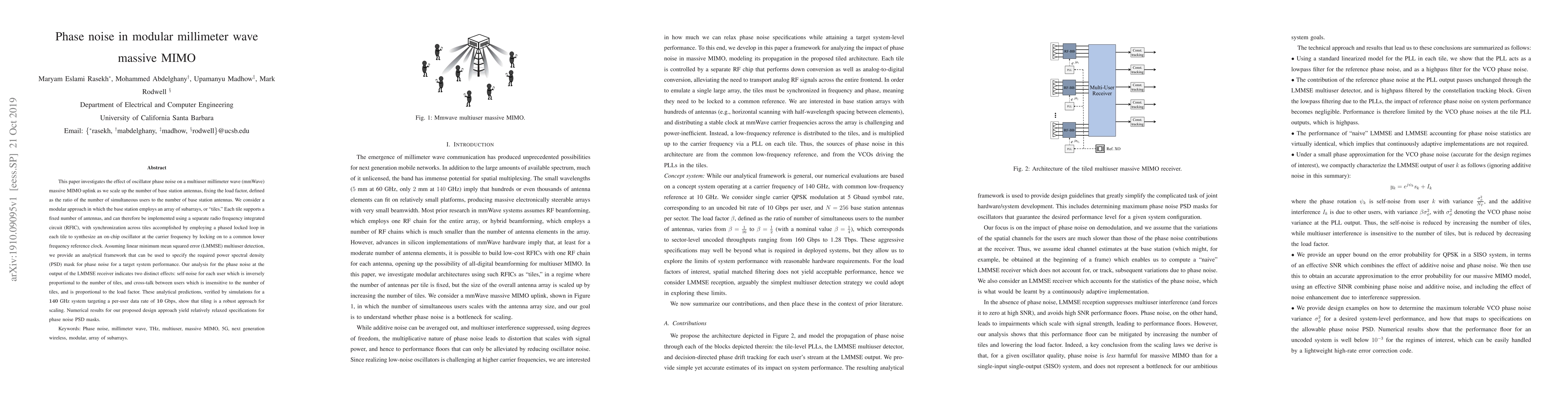 This paper investigates the effect of oscillator phase noise on a multiuser millimeter wave (mmWave) massive MIMO uplink as we scale up the number of base station antennas, fixing the load factor, defined as the ratio of the number of simultaneous users to the number of base station antennas. We consider a modular approach in which the base station employs an array of subarrays, or "tiles." Each tile supports a fixed number of antennas, and can therefore be implemented using a separate radio frequency integrated circuit (RFIC), with synchronization across tiles accomplished by employing a phased locked loop in each tile to synthesize an on-chip oscillator at the carrier frequency by locking on to a common lower frequency reference clock. Assuming linear minimum mean squared error (LMMSE) multiuser detection, we provide an analytical framework that can be used to specify the required power spectral density (PSD) mask for phase noise for a target system performance. Our analysis for the phase noise at the output of the LMMSE receiver indicates two distinct effects: self-noise for each user which is inversely proportional to the number of tiles, and cross-talk between users which is insensitive to the number of tiles, and is proportional to the load factor. These analytical predictions, verified by simulations for a 140 GHz system targeting a per-user data rate of 10 Gbps, show that tiling is a robust approach for scaling. Numerical results for our proposed design approach yield relatively relaxed specifications for phase noise PSD masks.