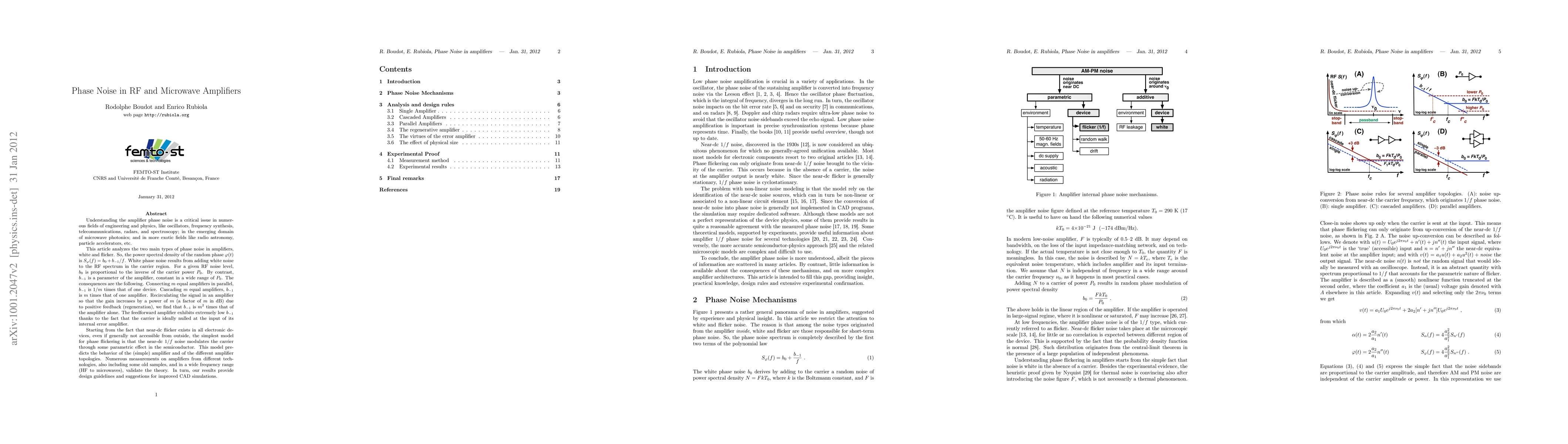 The paper presents a comprehensive analysis of phase noise in RF and microwave amplifiers, including theoretical models and experimental validation for various amplifier configurations.