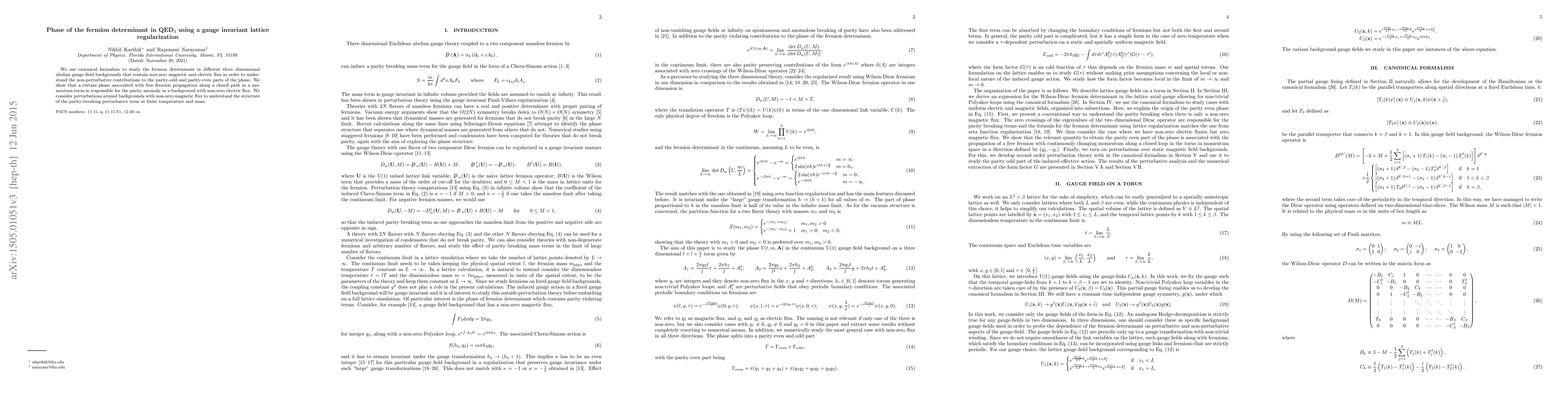 We use canonical formalism to study the fermion determinant in different three dimensional abelian gauge field backgrounds that contain non-zero magnetic and electric flux in order to understand the non-perturbative contributions to the parity-odd and parity-even parts of the phase. We show that a certain phase associated with free fermion propagation along a closed path in a momentum torus is responsible for the parity anomaly in a background with non-zero electric flux. We consider perturbations around backgrounds with non-zero magnetic flux to understand the structure of the parity-breaking perturbative term at finite temperature and mass.