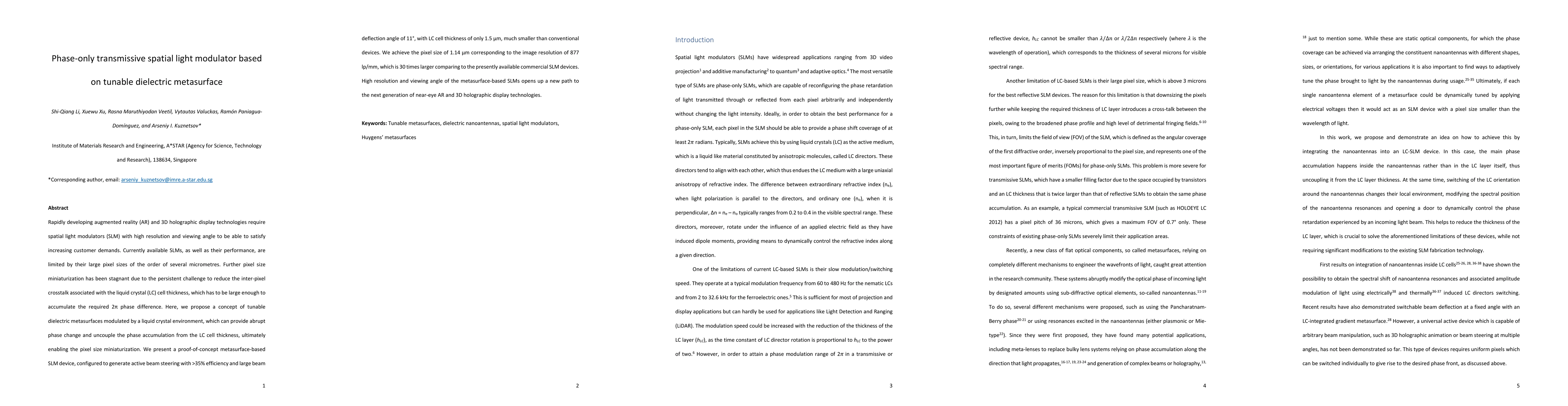 The introduction of a tunable Huygens’ metasurface that provides abrupt phase change, decouples phase accumulation from LC cell thickness, and enables pixel size miniaturization.