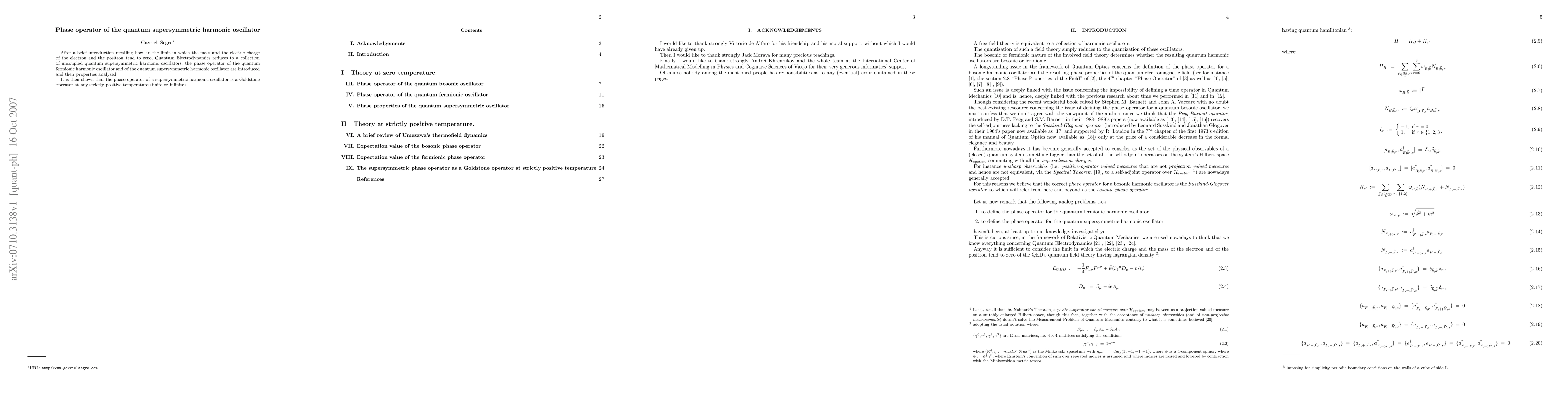 After a brief introduction recalling how, in the limit in which the mass and the electric charge of the electron and the positron tend to zero, Quantum Electrodynamics reduces to a collection of uncoupled quantum supersymmetric harmonic oscillators, the phase operator of the quantum fermionic harmonic oscillator and of the quantum supersymmetric harmonic oscillator are introduced and their properties analyzed. It is then shown that the phase operator of a supersymmetric harmonic oscillator is a Goldstone operator at any strictly positive temperature (finite or infinite).