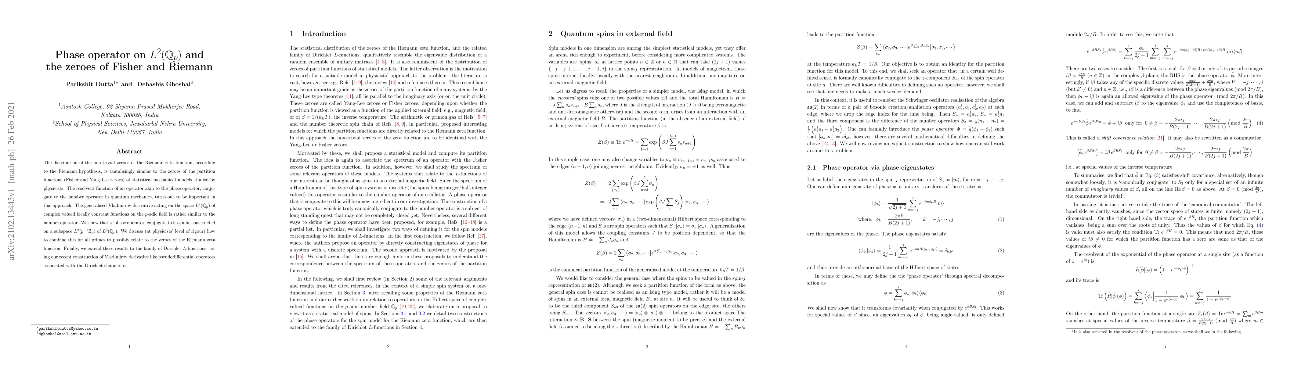 This paper constructs a phase operator on $L^2(\mathbb{Q}_p)$ and explores its connection to the zeroes of the Riemann zeta function and Fisher zeroes. It combines the generalised Vladimirov derivative with pseudodifferential operators to potentially relate these mathematical constructs to statistical mechanics and number theory.